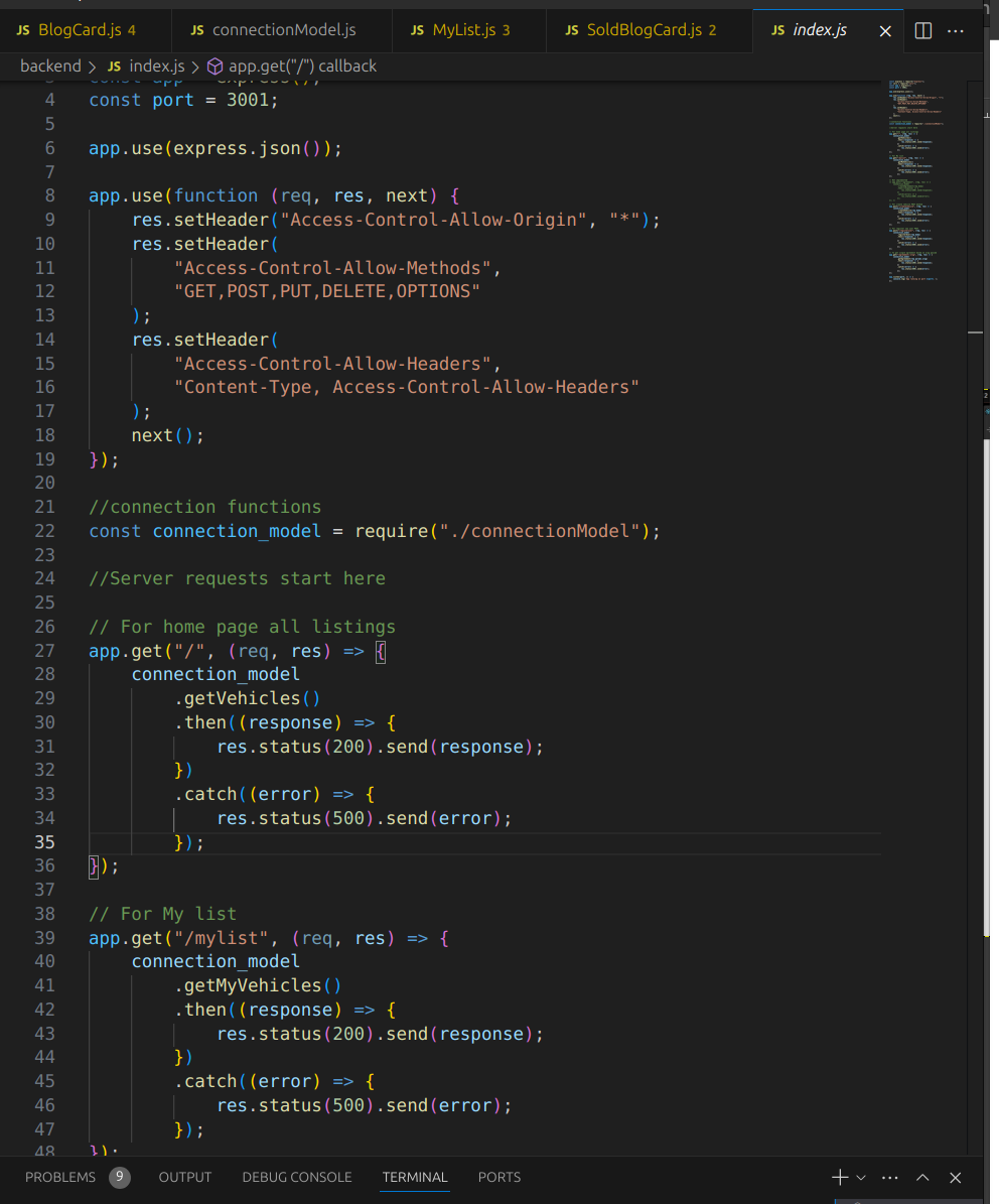 Ова е изгледот на серверот. Имаме getMyVehicles функција која се повикува на /mylist рутата, која потоа па го проследува прашалникот на датабазата.
