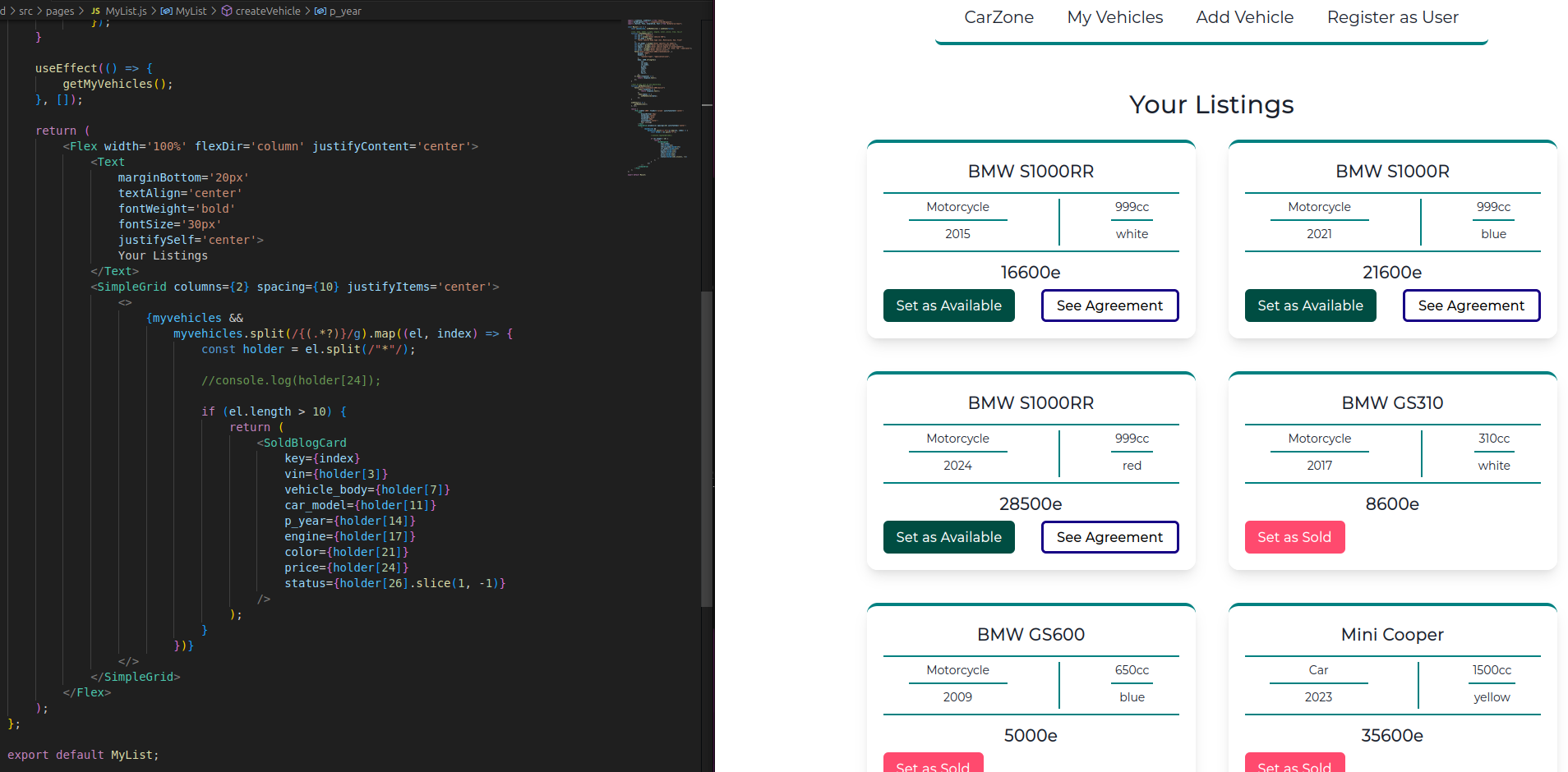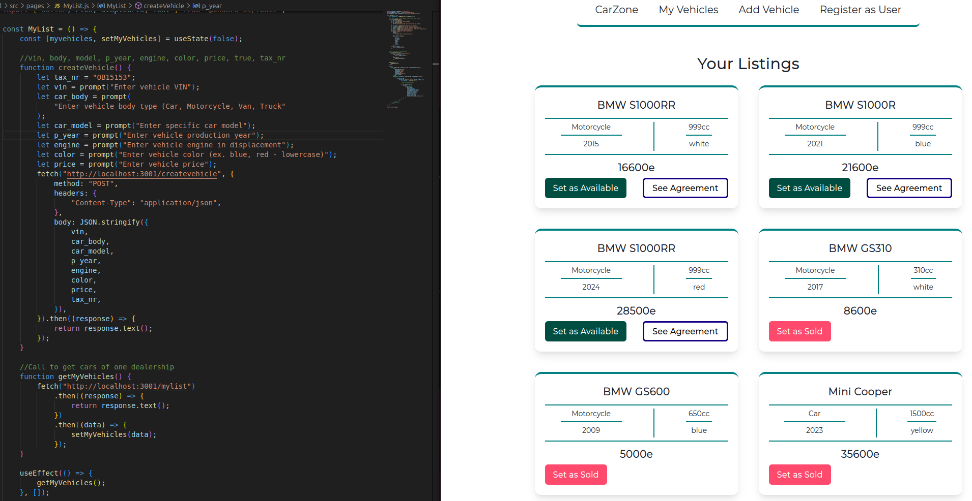 Ова е како изгледа апликацијата. Повторно, имаме функција getMyVehicles која ги враќа сите мои возила. Не се користи createVehicle бидејќи креирањето на нов оглас е на нова страна, ова треба само да се отстрани.