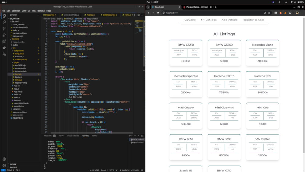 Ова е изгледот на апликацијата и кодот. Има функција getVehicles која испраќа барање до серверот Node.js за листање на сите возила.