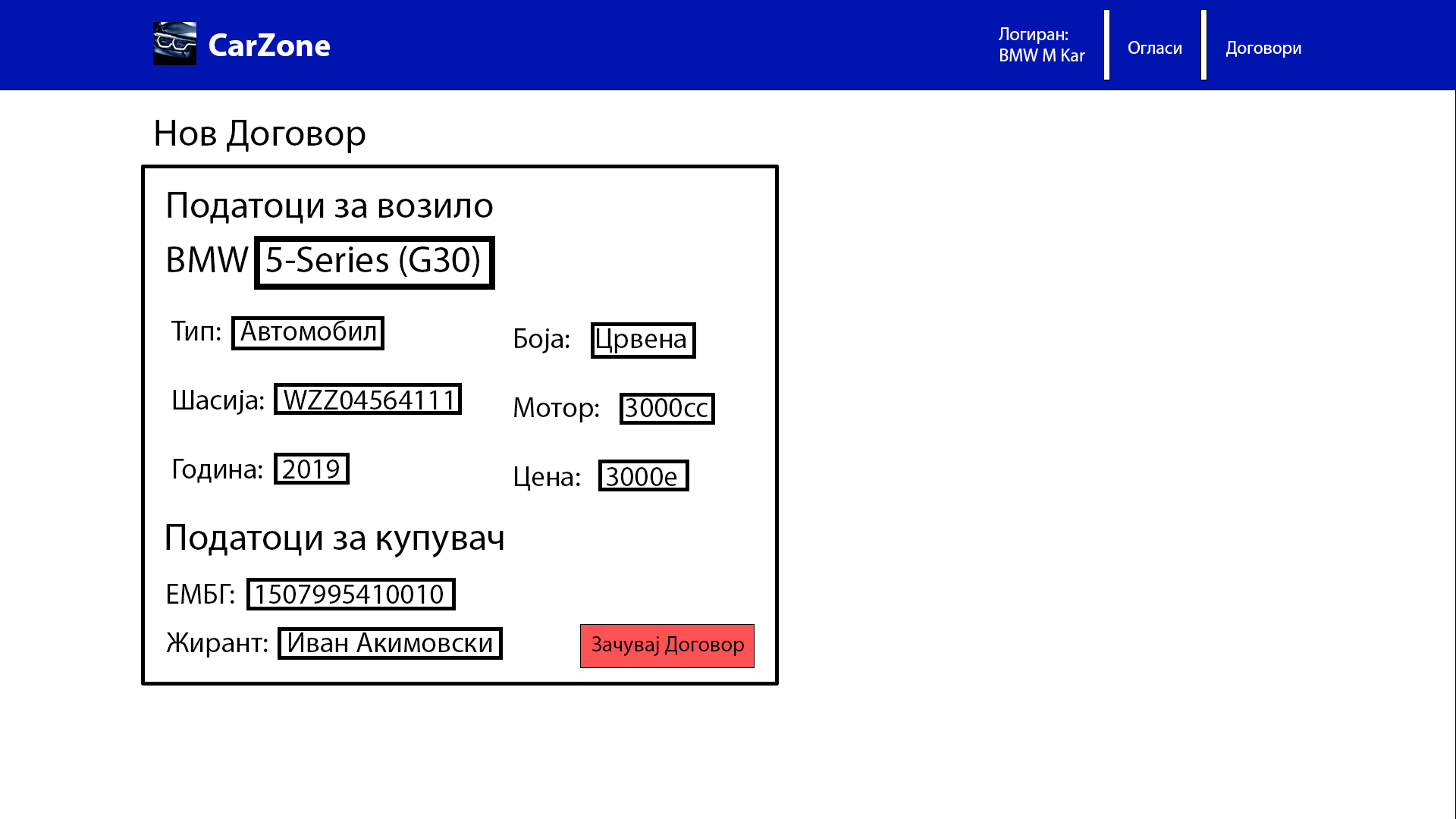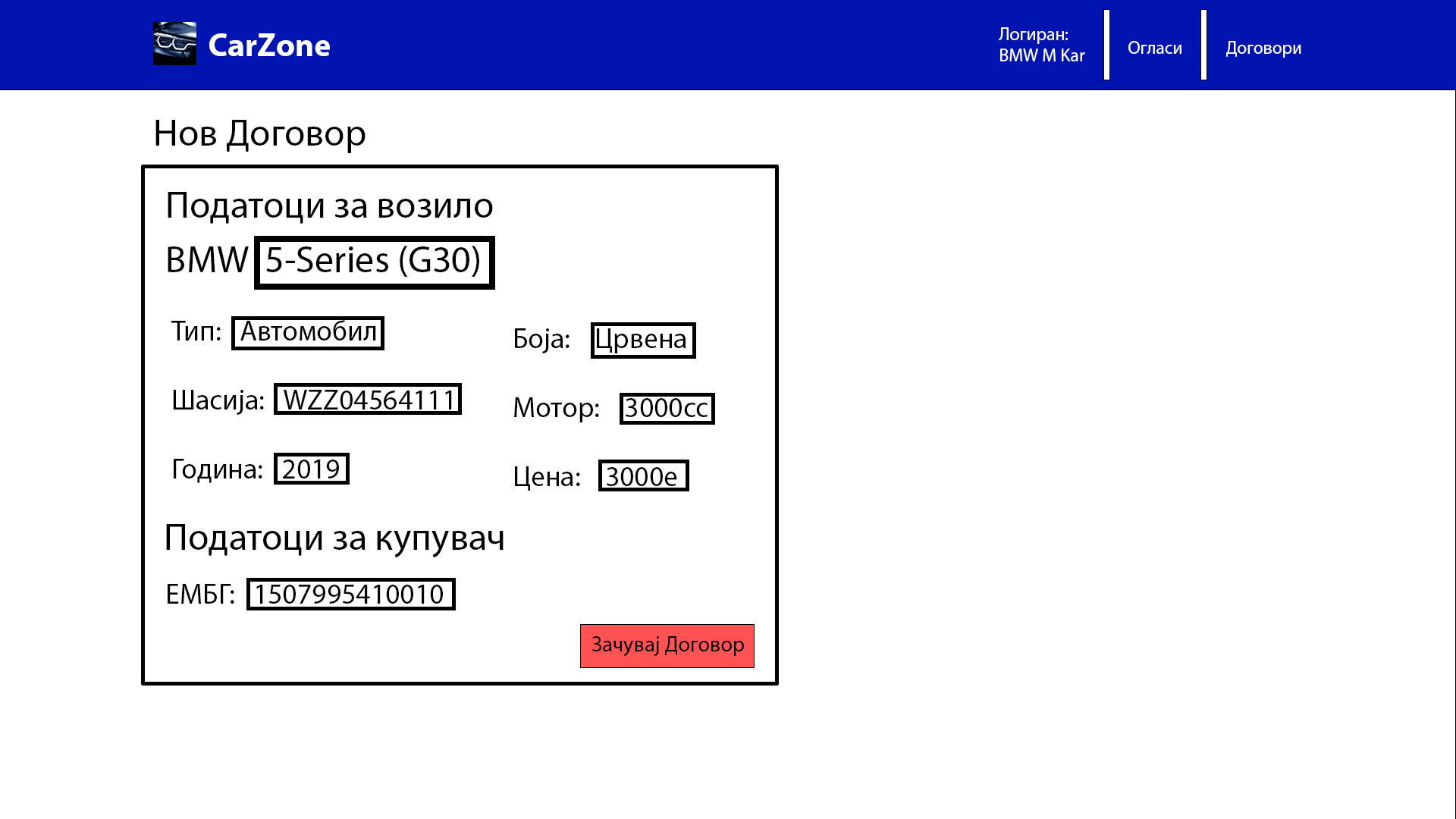 - Претставникот ги пополнува потребните информации за договорот, како што се цена и датум, но исто така внесува детали за возилото со тоа што пополнува број на шасија за возилото (VIN), и матичен број на купувачот.