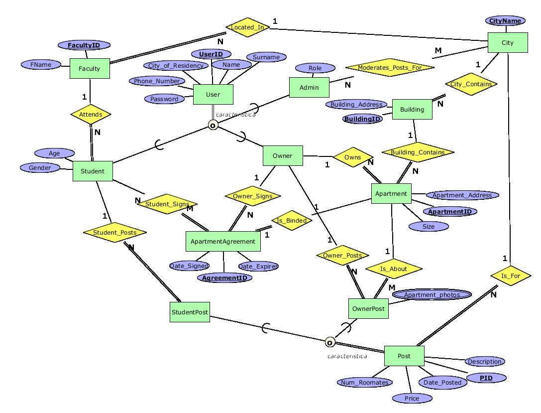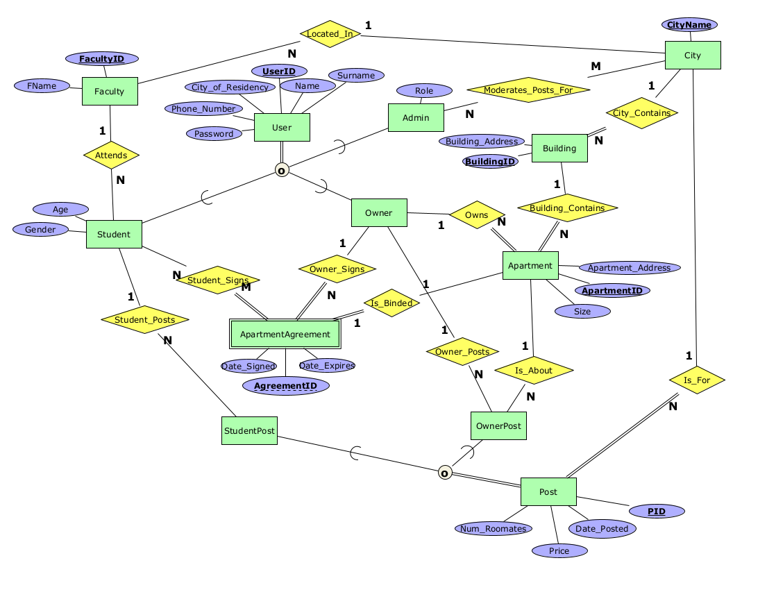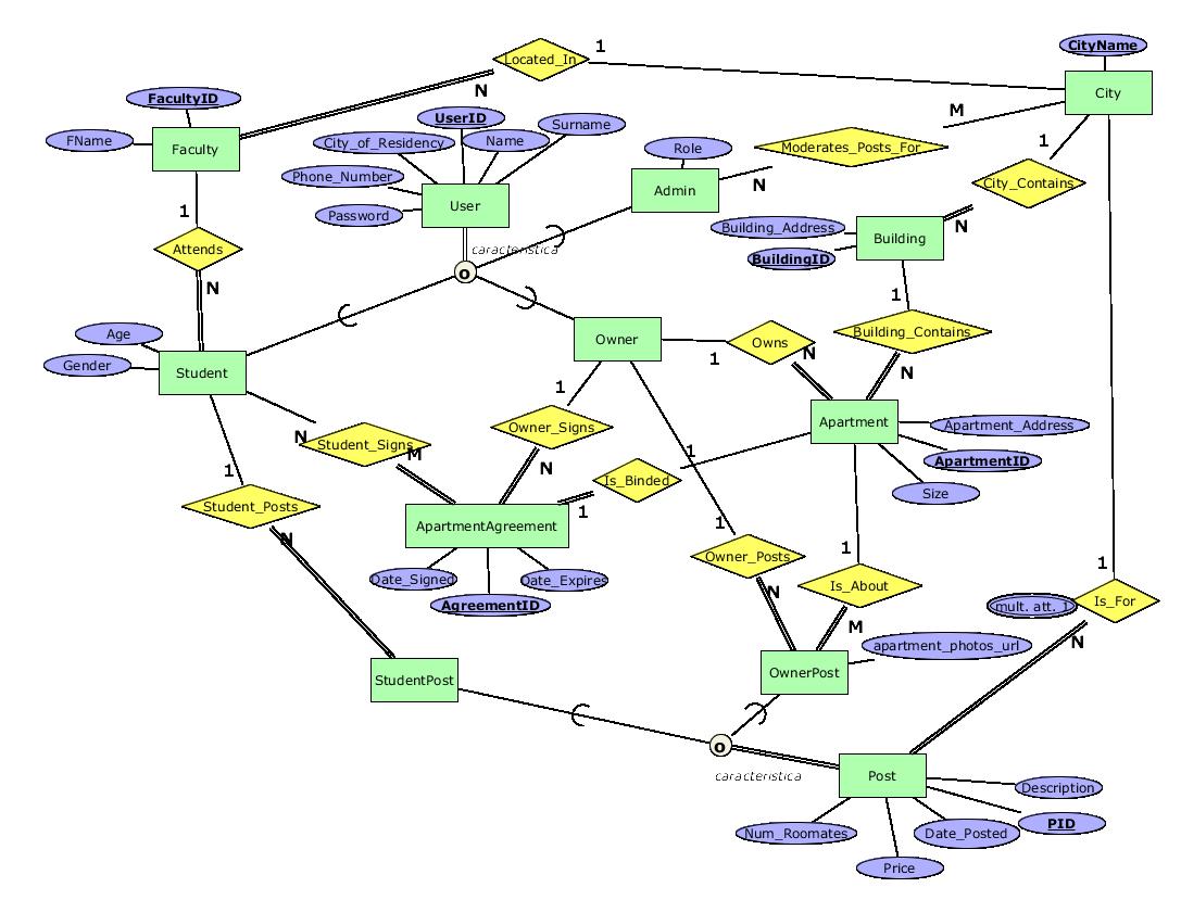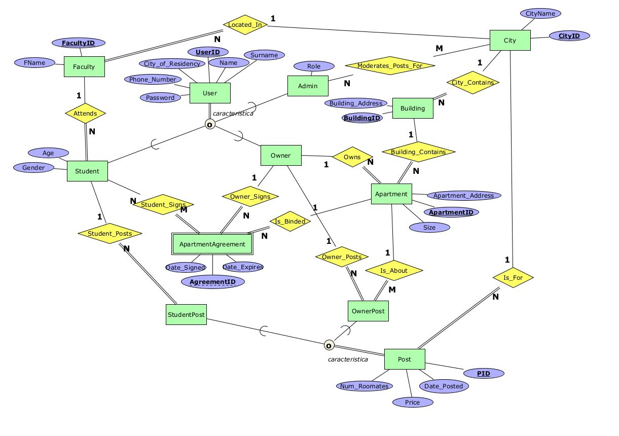 - Is_About - Релација помеѓу ентитетите Apartment и OwnerPost. Релацијата означува објавата од газдата за кој стан е наменета. 1-М релација бидејќи 1 стан може да има повеќе објави за него, додека 1 објава е наменета за само 1 стан. Тотално учество од страната на OwnerPost, парцијално учество од Apartment.