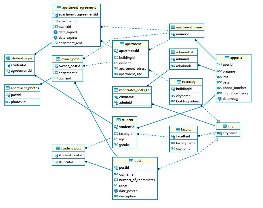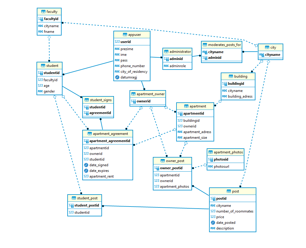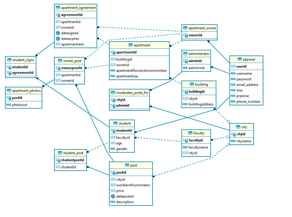 - ApartmentAgreement(AgreementID, ApartmentID*(Apartment),UserID*(Owner), Date_Signed,Date_Expires,ApartmentRent)