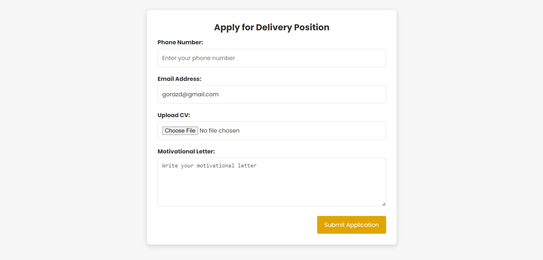 Корисникот ја пристапува страницата /application каде што го пополнува формуларот за вработување како доставувач и го кликнува копчето Submit Application.