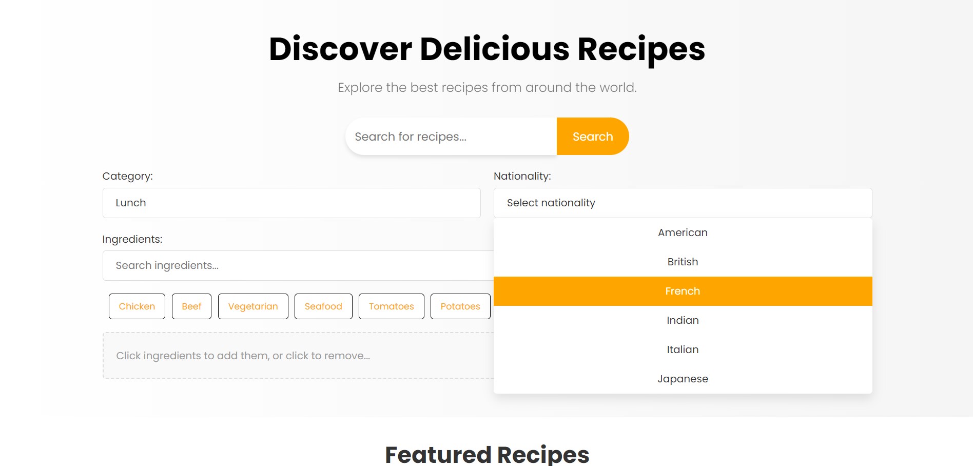 Корисникот се наоѓа на home страницата и пристапува кон различните филтри за специфицирање на посакувани рецепти.