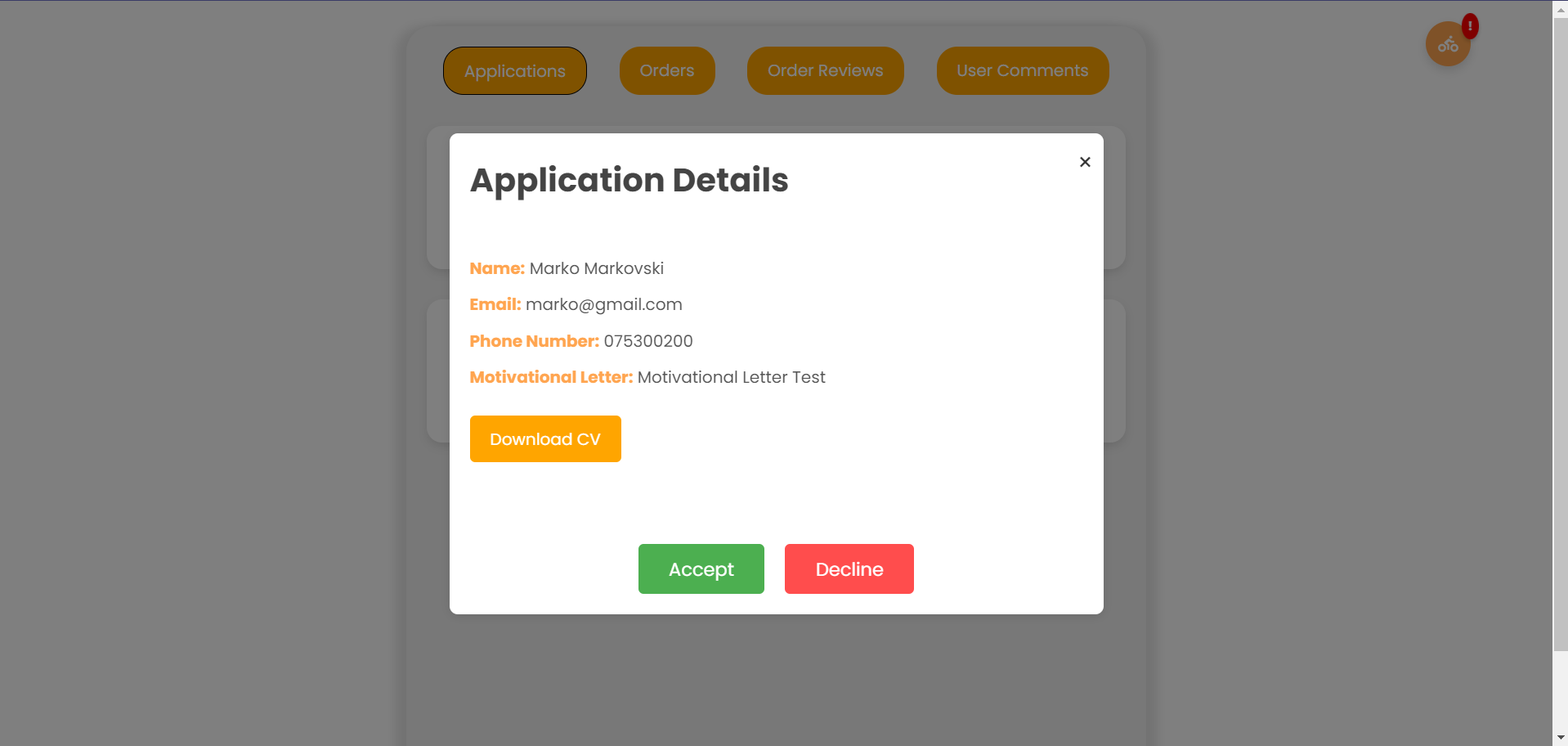 Селектира одредена апликација и бира дали сака да го симне CV-то, да го прифати или одбие доставувачот.