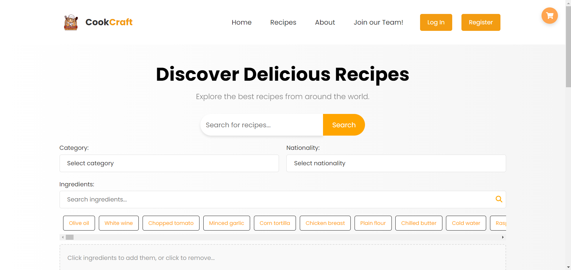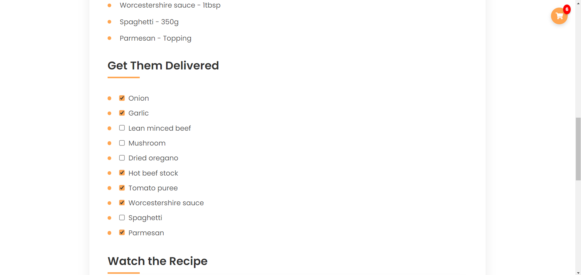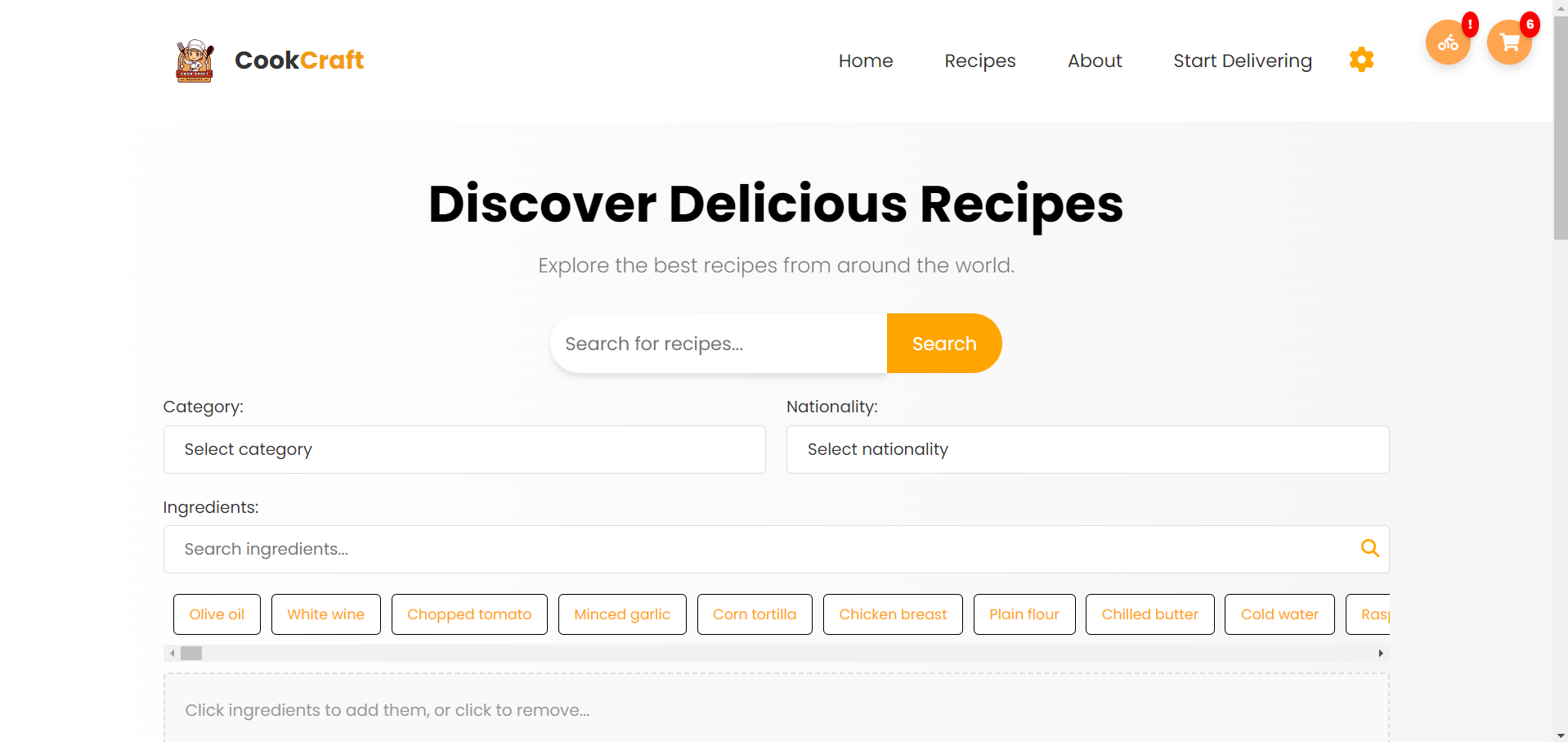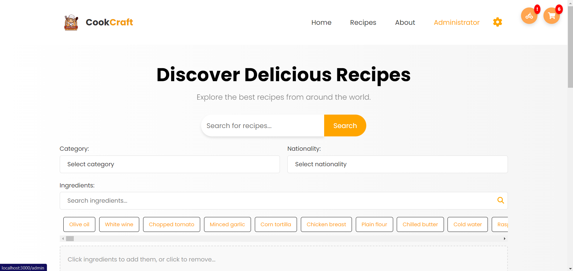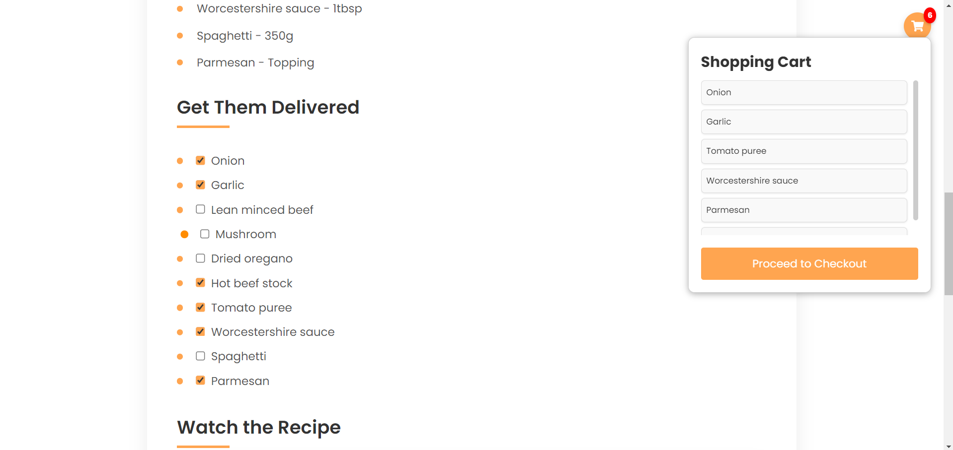 Корисникот го селектира одредениот рецепт и се навигира кон секцијата за намирници и го клика копчето за нарачка или кошничката