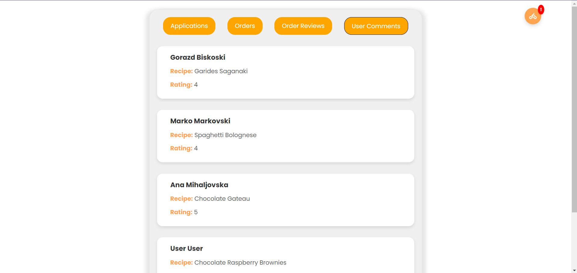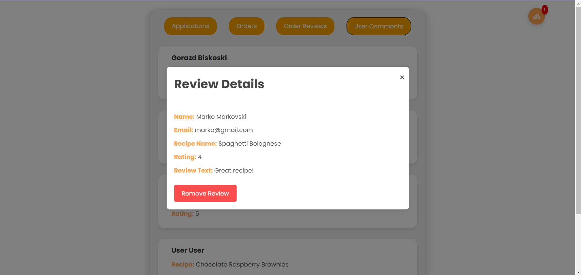 Администраторот од погледот за предлег на апликации го клика копчето за преглед на коментари за рецептите.