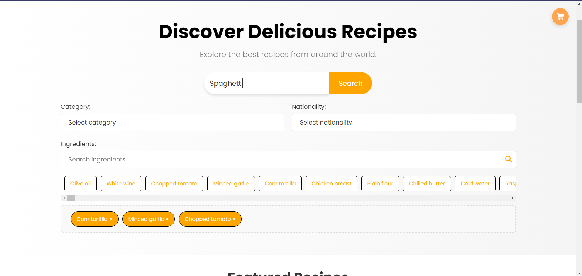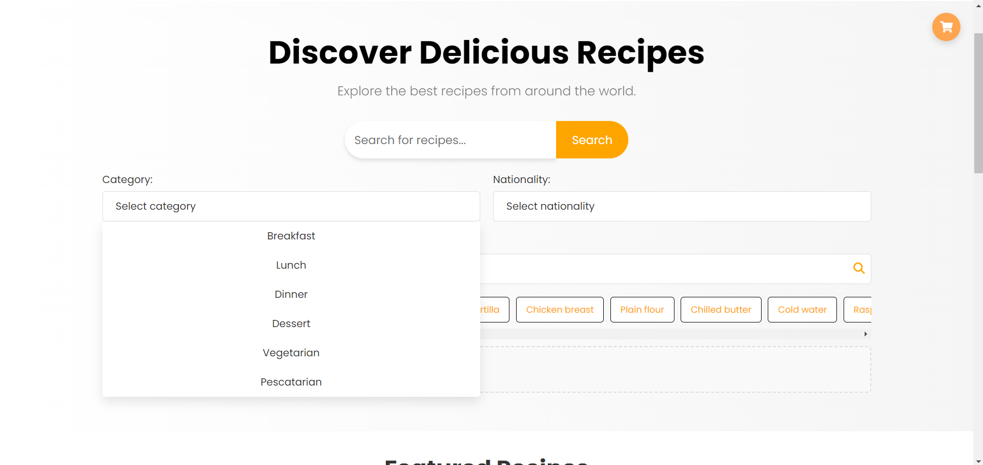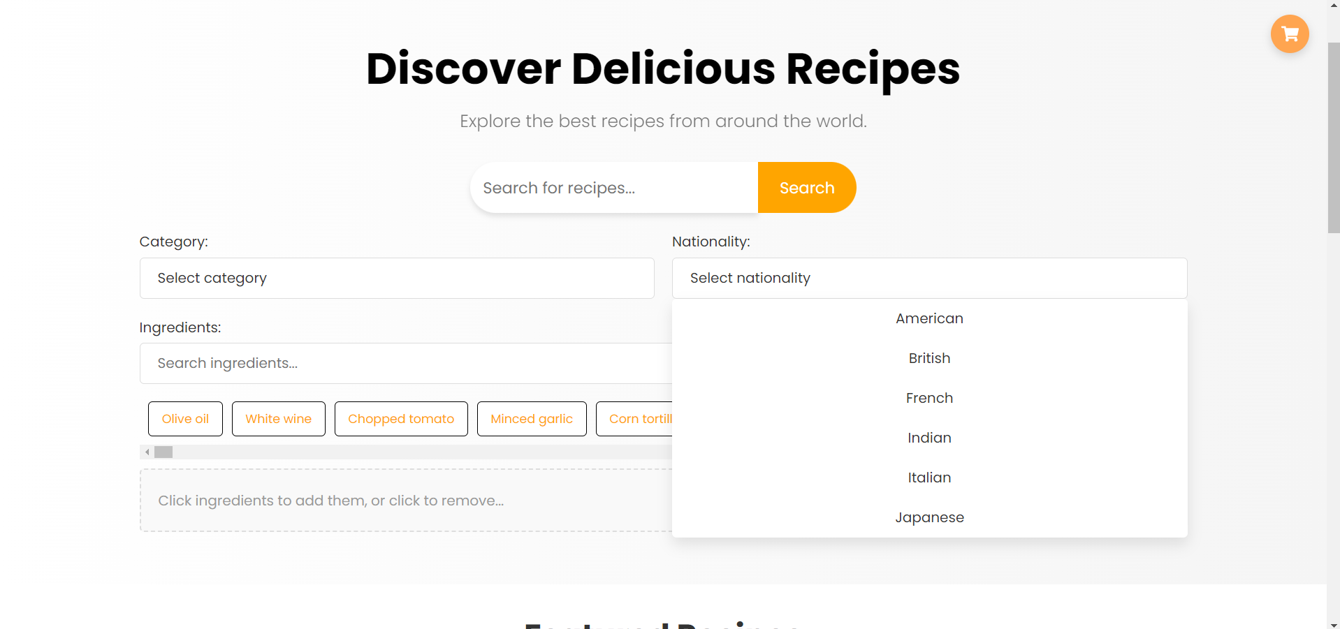 Корисникот го користи филтерот за пребарување на рецепти од предодредени националитети