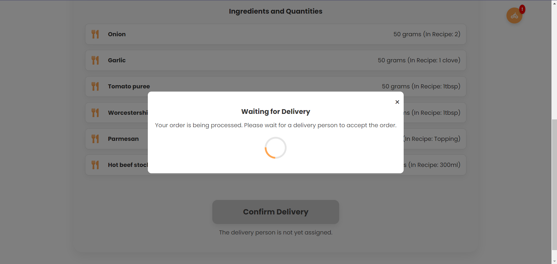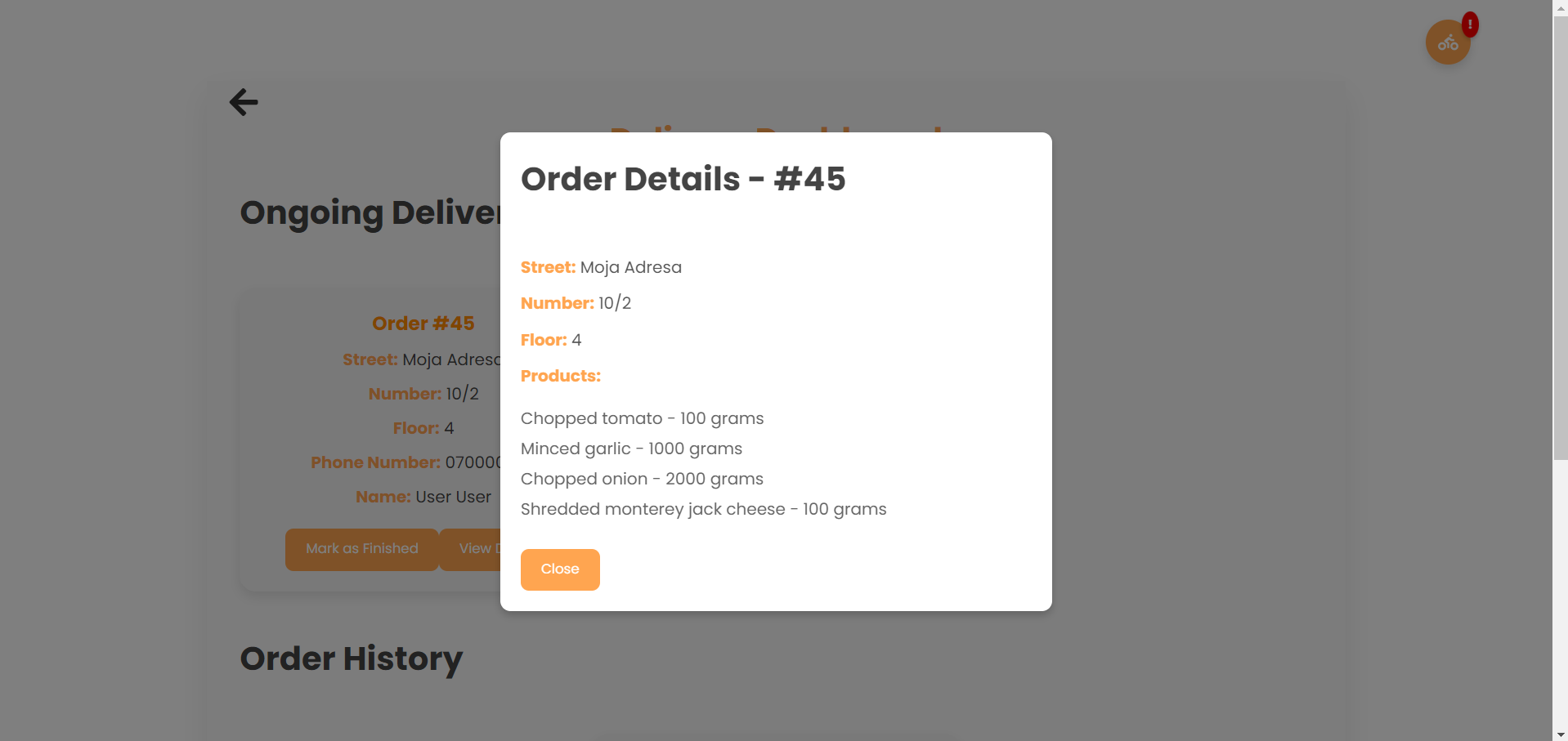 При финализација на нарачката се отвара модален прозорец да го извести корисникот дека нарачката е успешно поднесена и дека се чека на доставувач да ја прифати побарувачката