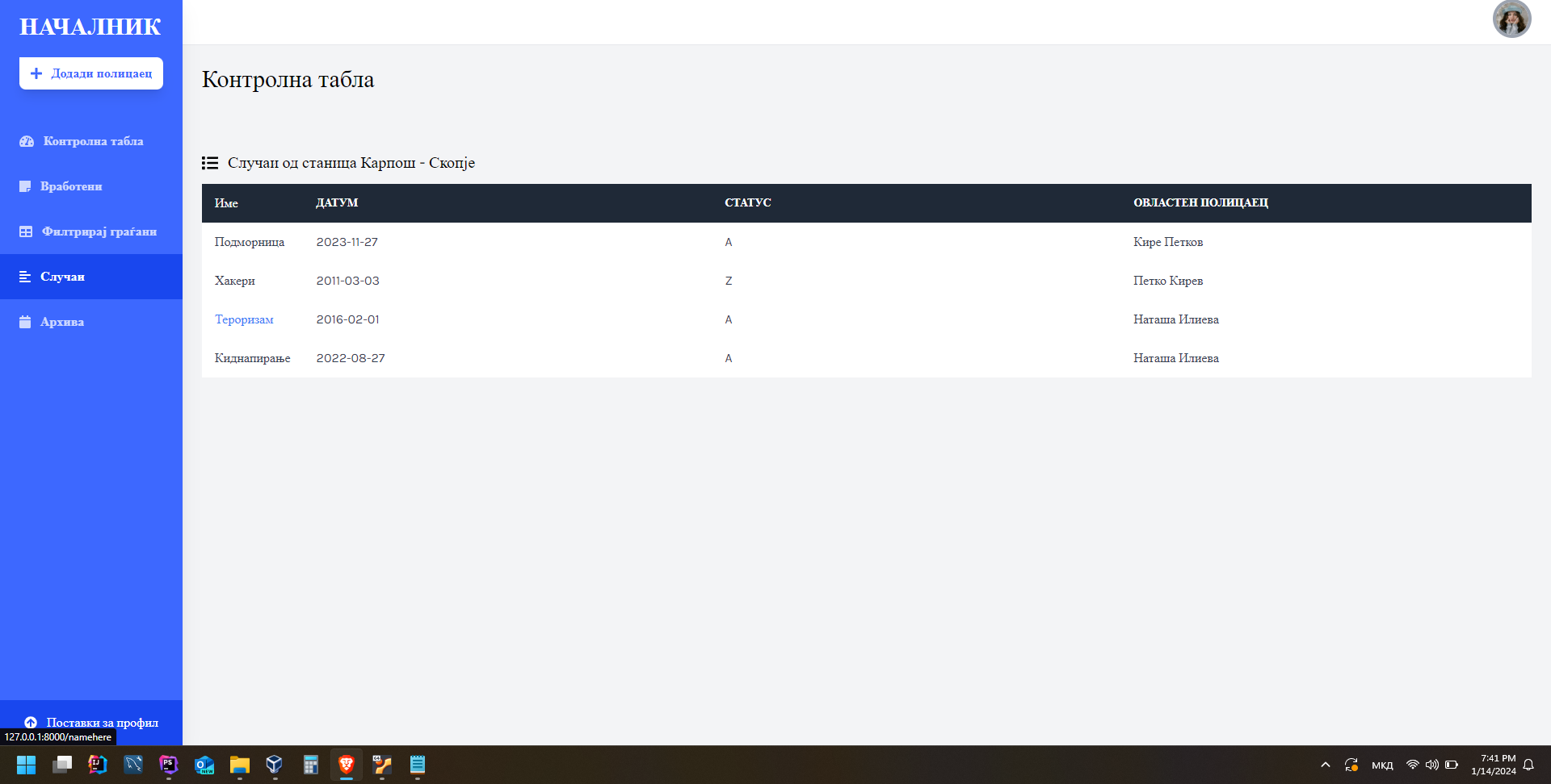 На корисникот ќе му бидат прикажани следните податоци за еден случај: ИД на случајот, Име на случајот, датум кога е отворен тој случај, Статус, Докази, Тип на криминал, Изјави.