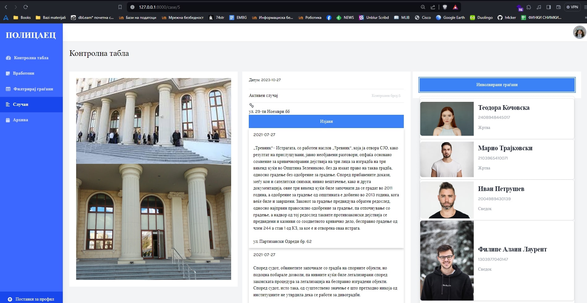 - При кликање на името на еден од случаите ќе се пренасочи кон деталниот приказ на случајот, каде што се листаат информациите за случајот, изјавите за тој случај како и доказите во форма на слика.