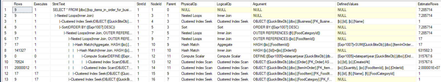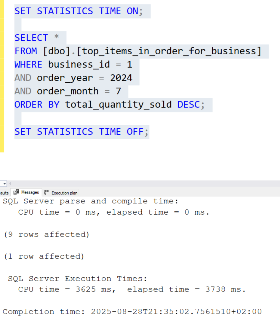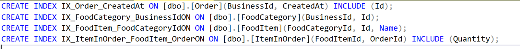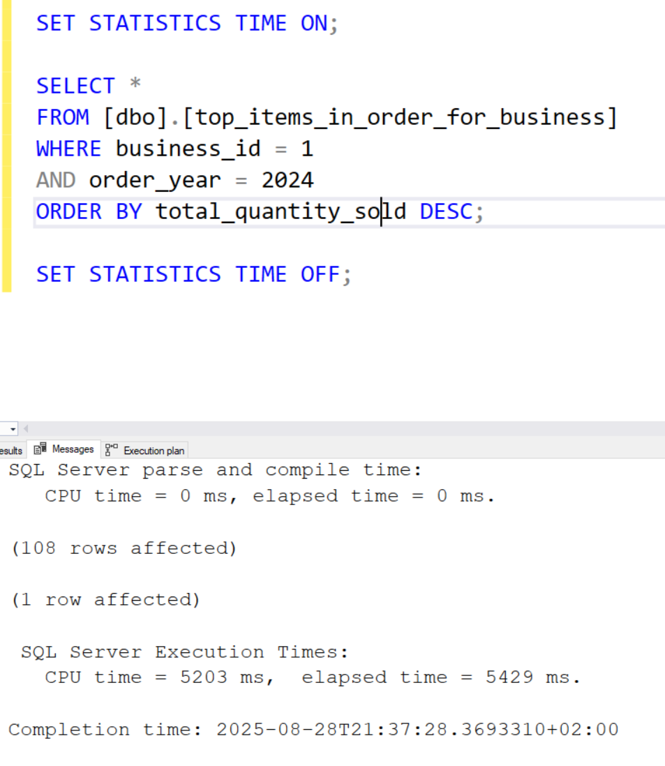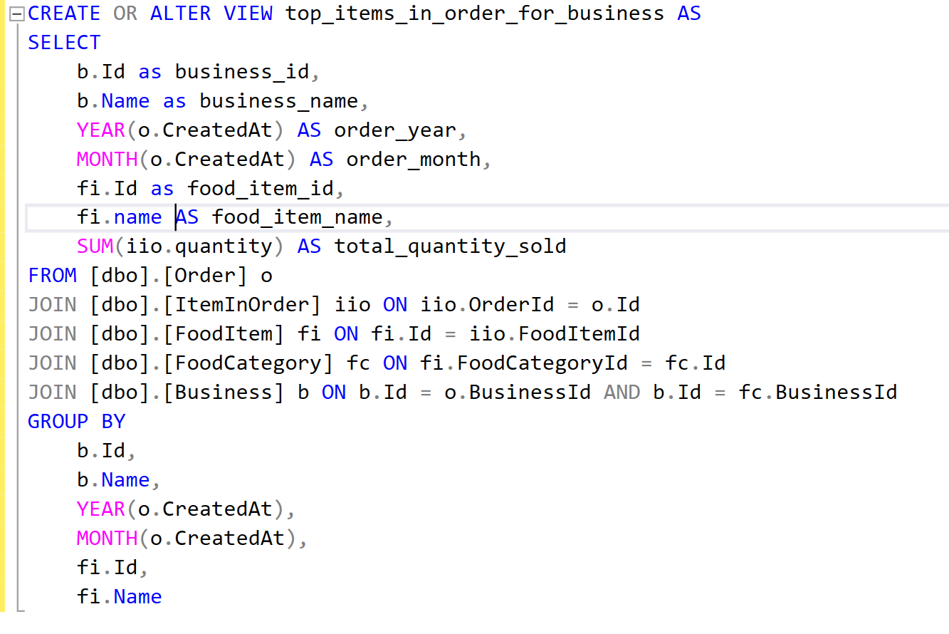 Овој поглед служи со цел бизнисите да имаат преглед на најпродаваните производи за одреден месец и година. Ваквиот поглед би се користел од страна на корисниците кои што ја имаат улогата на BUSINESS_ADMIN во нашиот систем. Поради тоа што правиме поврзување на повеќе табели, потребно е да креираме и неколку индекси со што прашалниците кои би се извршувале врз погледот “[top_items_in_order_for_business]” имаат подобри перформанси.