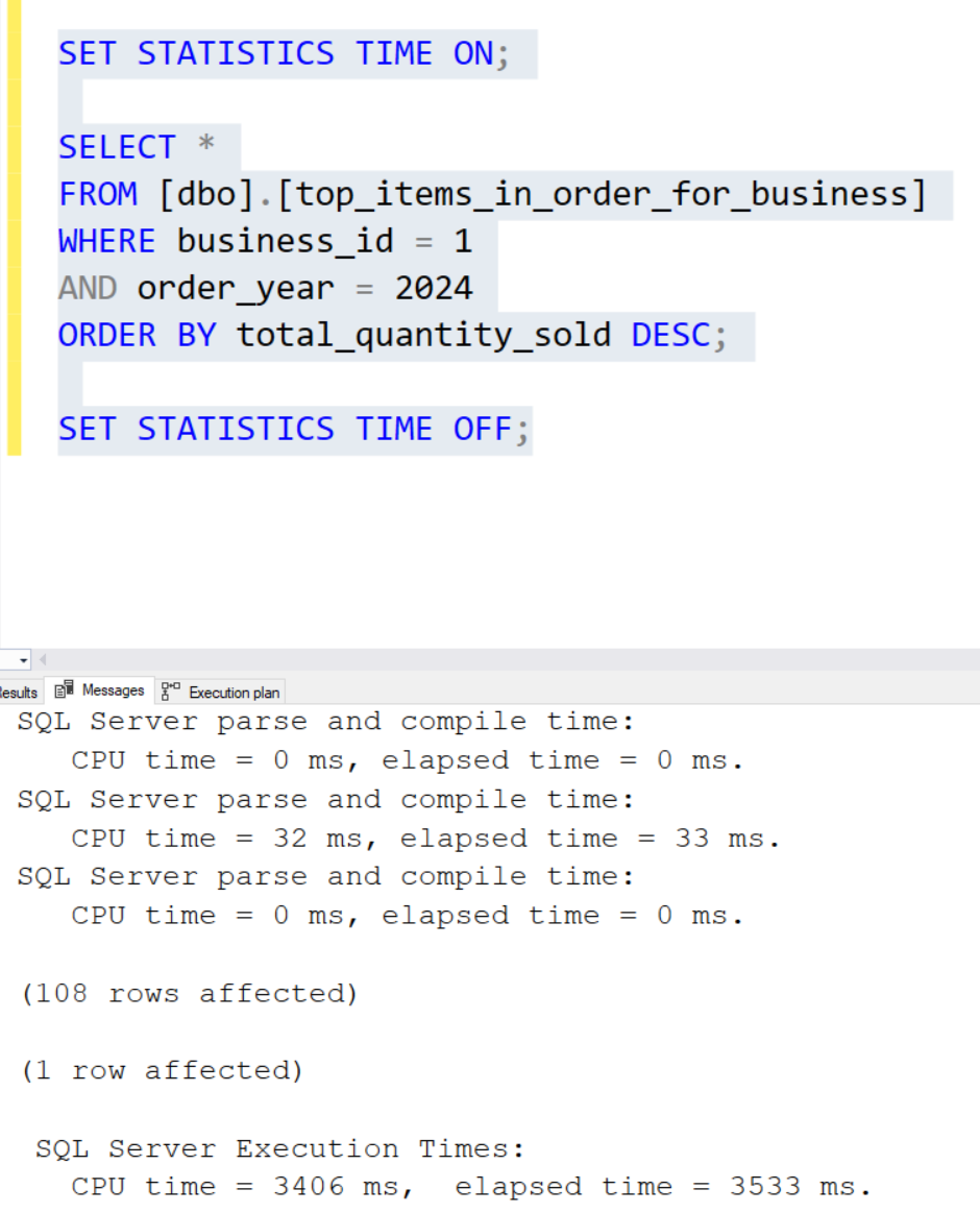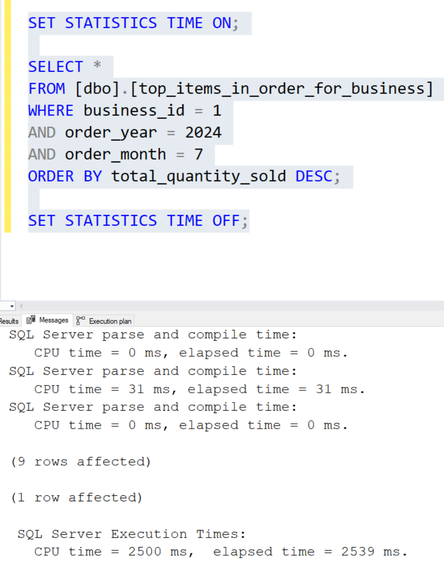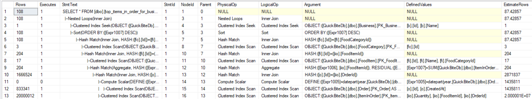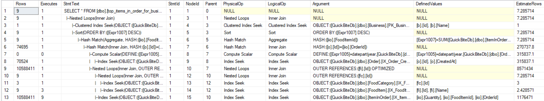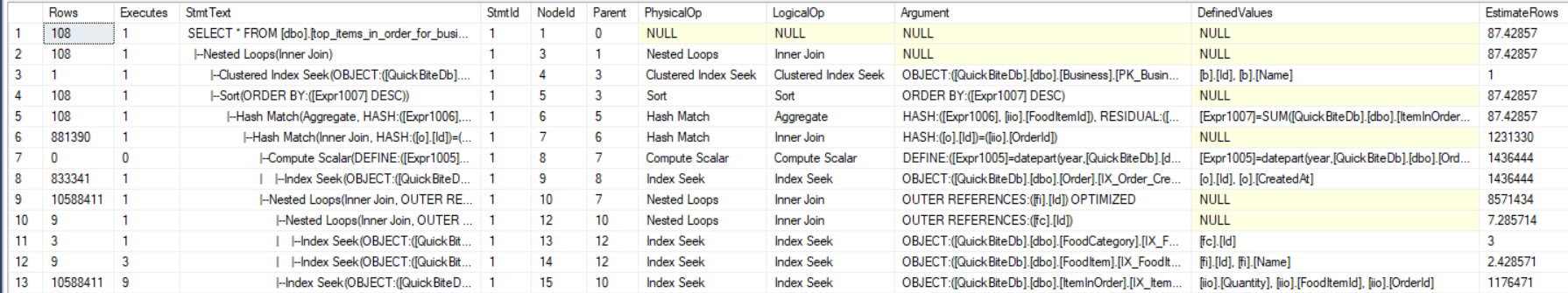 Овој поглед служи со цел бизнисите да имаат преглед на најпродаваните производи за одреден месец и година. Ваквиот поглед би се користел од страна на корисниците кои што ја имаат улогата на BUSINESS_ADMIN во нашиот систем. Поради тоа што правиме поврзување на повеќе табели, потребно е да креираме и неколку индекси со што прашалниците кои би се извршувале врз погледот “[top_items_in_order_for_business]” имаат подобри перформанси.