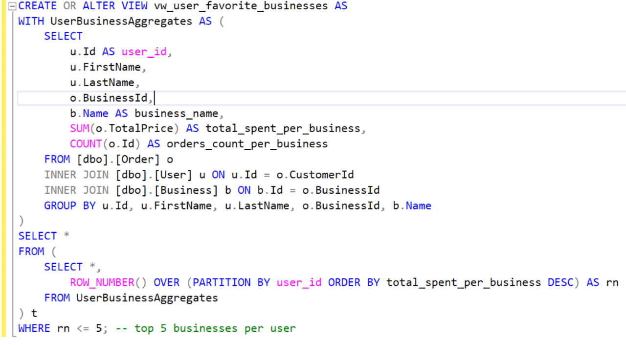 Преку ваквиот поглед би можеле да ги добиеме омилените бизниси од кој што купувал корисникот според тоа колку потрошил кај самиот бизнис. Затоа што перформансите на прашалниците кои се поврзани со овој поглед се прилично добри околу (400 ms) немаме креирано некои дополнителни индекси. Но доколку перформансите ослабнат потенцијални индекси би биле:
