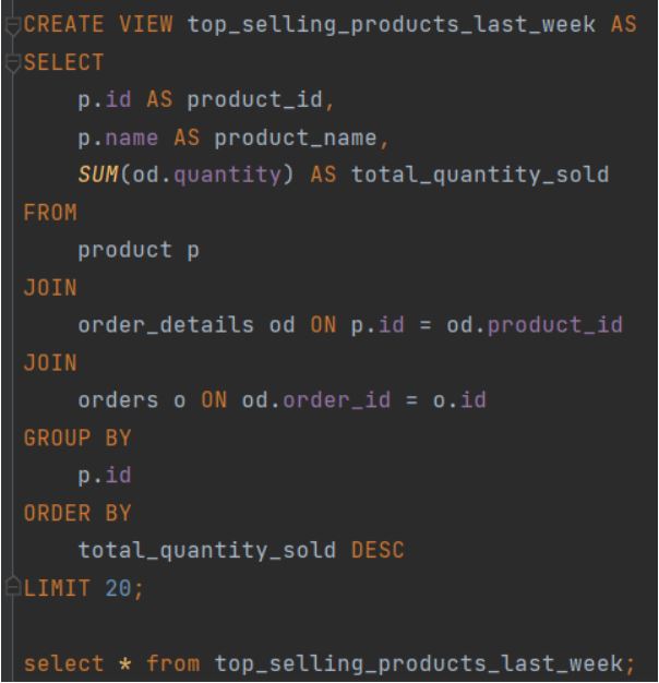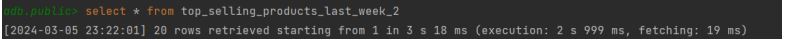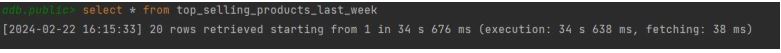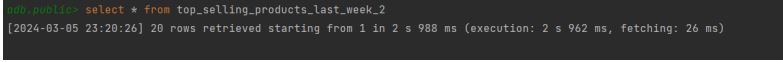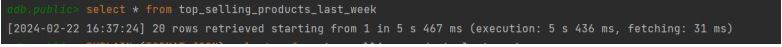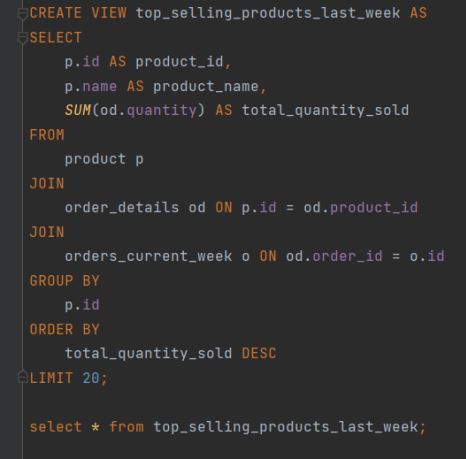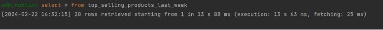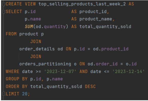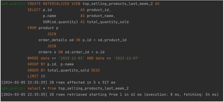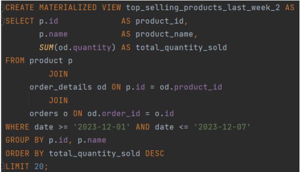 - На сликата подолу, се креира материјализиран поглед во кој се наоѓаат најпродаваните 20 продукти за првата недела од декември 2023 година (тогаш се последните нарачки во табелата ‘orders’)