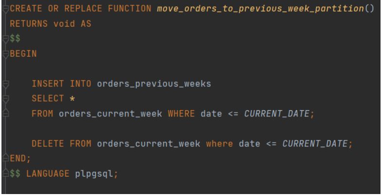 - Функција со помош на која ќе се извршува префрлување на нарачките од партицијата за тековната недела во партицијата за нарачки за минатото