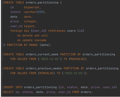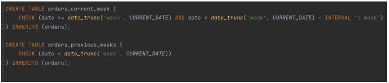 - На ваков начин, првата партиција ќе ги има сите нарачки за тековната недела, додека пак втората партиција би ги имала сите нарачки за датуми помали од тековната недела, меѓутоа не специфицираме точно до кој датум, туку проверките ќе се вршат врз основа на CURRENT_DATE што го зима точниот моментален датум во реално време