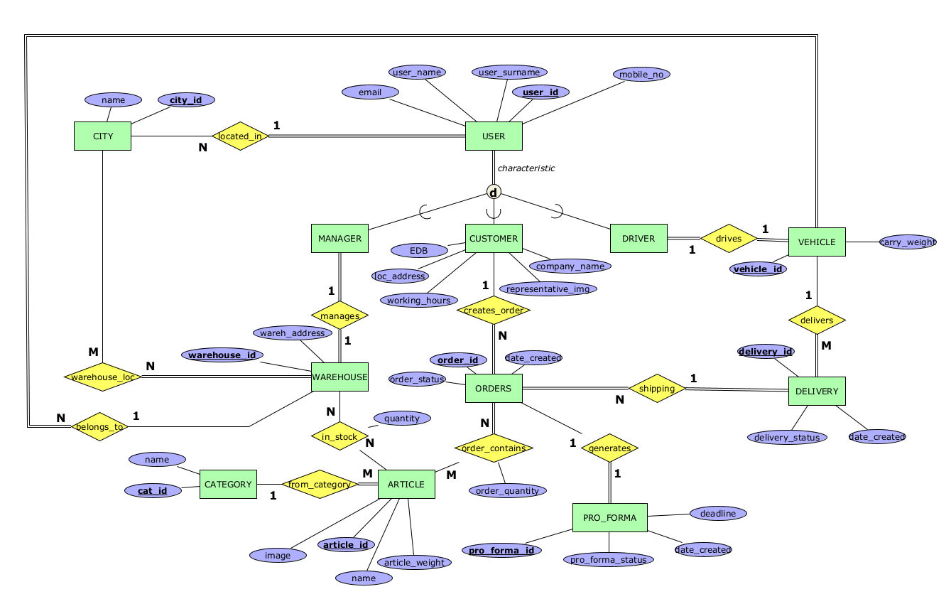 warehouse_location - релација помеѓу WAREHOUSE и CITY која означува во кој град се наоѓа еден магацин. Во еден град може да има 1 или повеќе магацини, а еден магацин мора да биде од само 1 град.