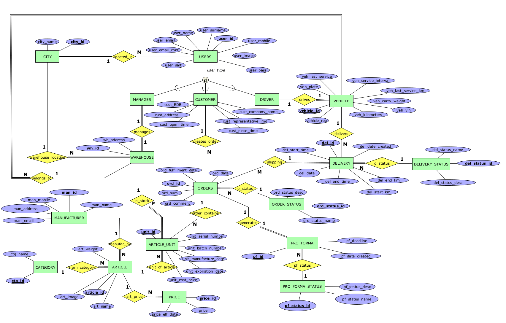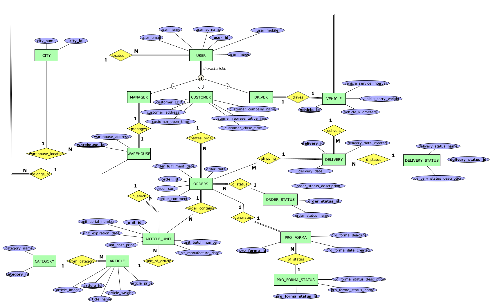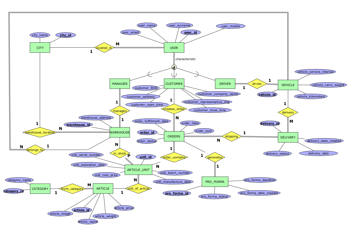 in_stock - релација помеѓу ARTICLE_UNIT и WAREHOUSE која означува една единка од некој артикл во кој магацин се наоѓа. Една единка мора да припаѓа на еден а може и на повеќе магацини, а еден магацин може да има 0 или повеќе единки од некој артикл.