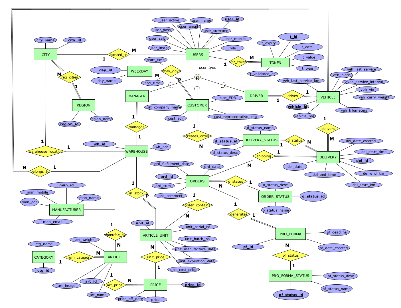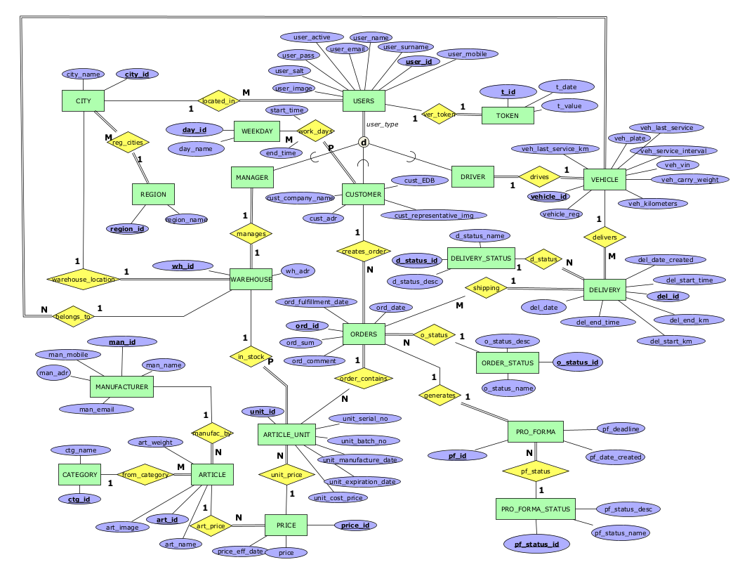 delivers - релација помеѓу DELIVERY и VEHICLE која означува кое возило ја врши одредена достава. Една достава мора да биде извршена од едно возило, а едно возило може да има извршено 0 или повеќе достави.