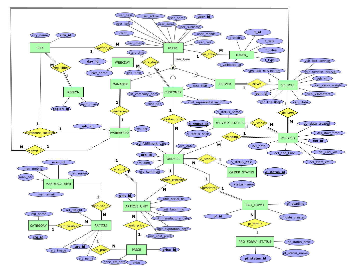 WAREHOUSE - ентитет кој чува податоци за магацини на дистрибуцијата.