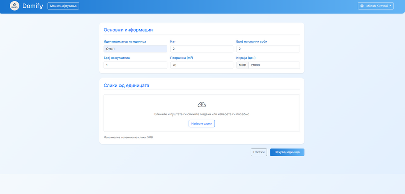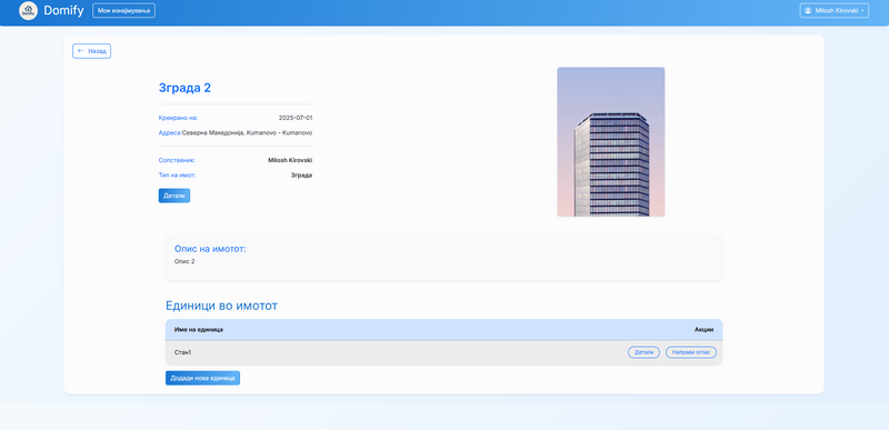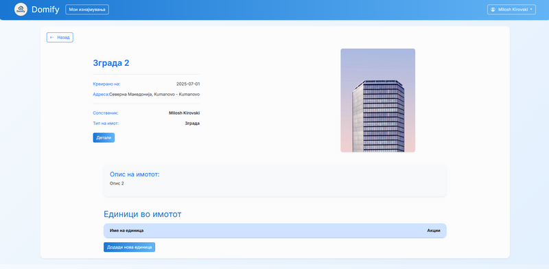 - Откако имотот е креиран, корисникот може да ги види деталите за тој имот и под секцијата "Единици во имотот" може да кликне на копчето "Додади нова единица" и со ова да пополни форма со сите информации креирање на единица и истата да ја додаде на имототот.