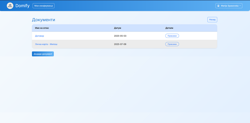 - По клик на документи корисникот се наоѓа на нова страница каде може да ги види ставките за различни документи поврзани со самото изнајмување како лични карти, договорот за изнајмување и др.