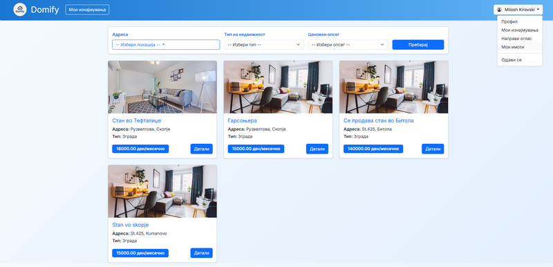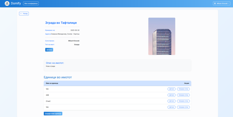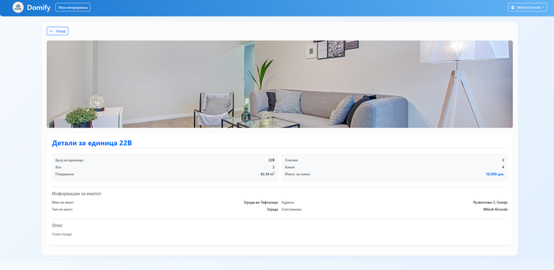 - Корисникот се наоѓа на страна каде се прикажани сите иниформации за дадениот имот како името, описот, слики. Како и кои единици припаѓаат на дадениот имот.