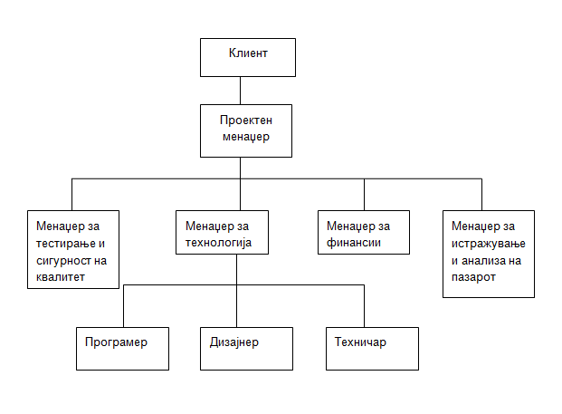 | Проектен менаџер | Го координира развојот на проектот и сите лица кои работат на истиот. Се грижи да секоја задача биде извршена соодветно во предвидениот рок. |