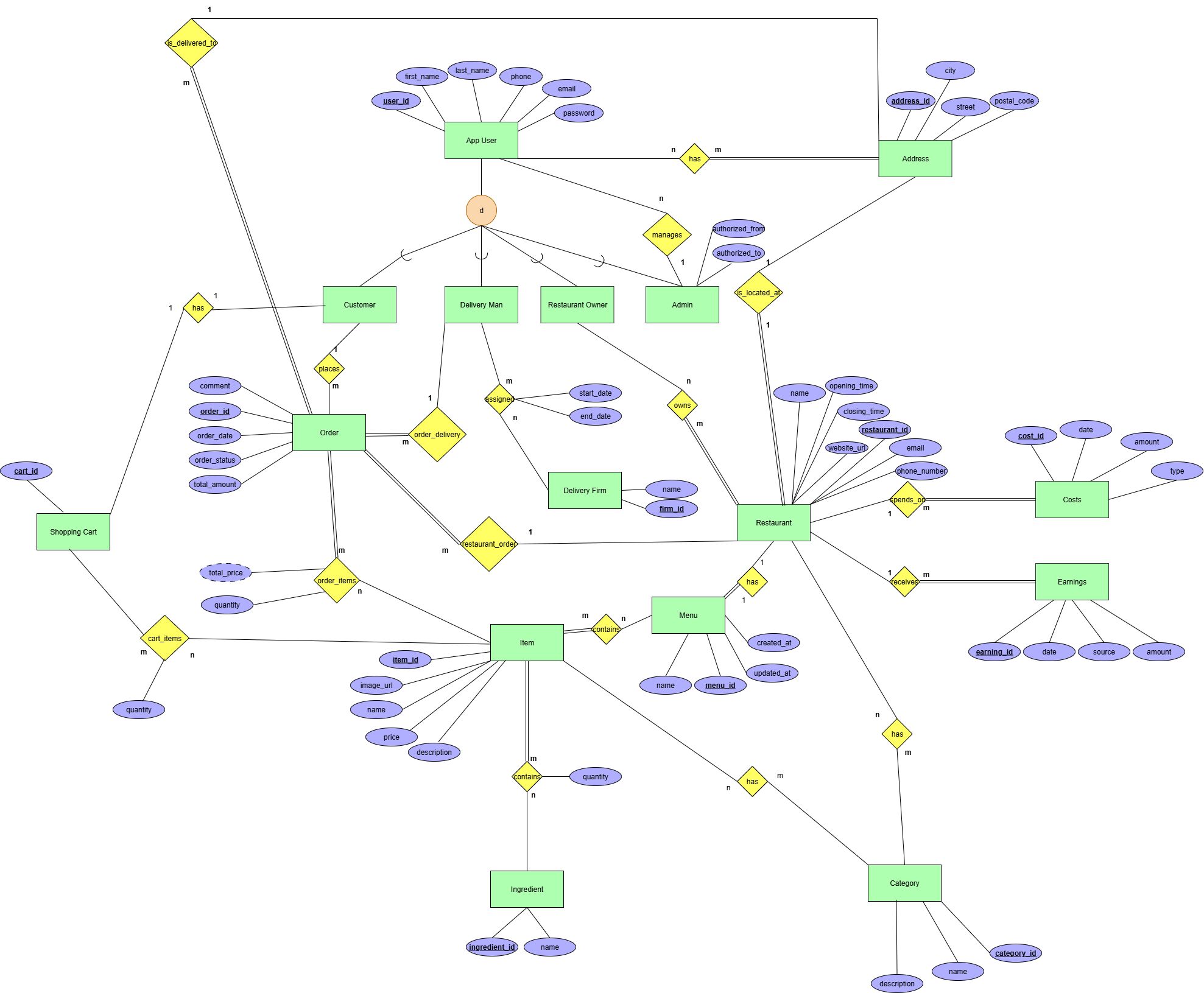 owns – relation between Restaurant Owner and Restaurant where a restaurant owner can own multiple restaurants and a restaurant can have multiple owners.