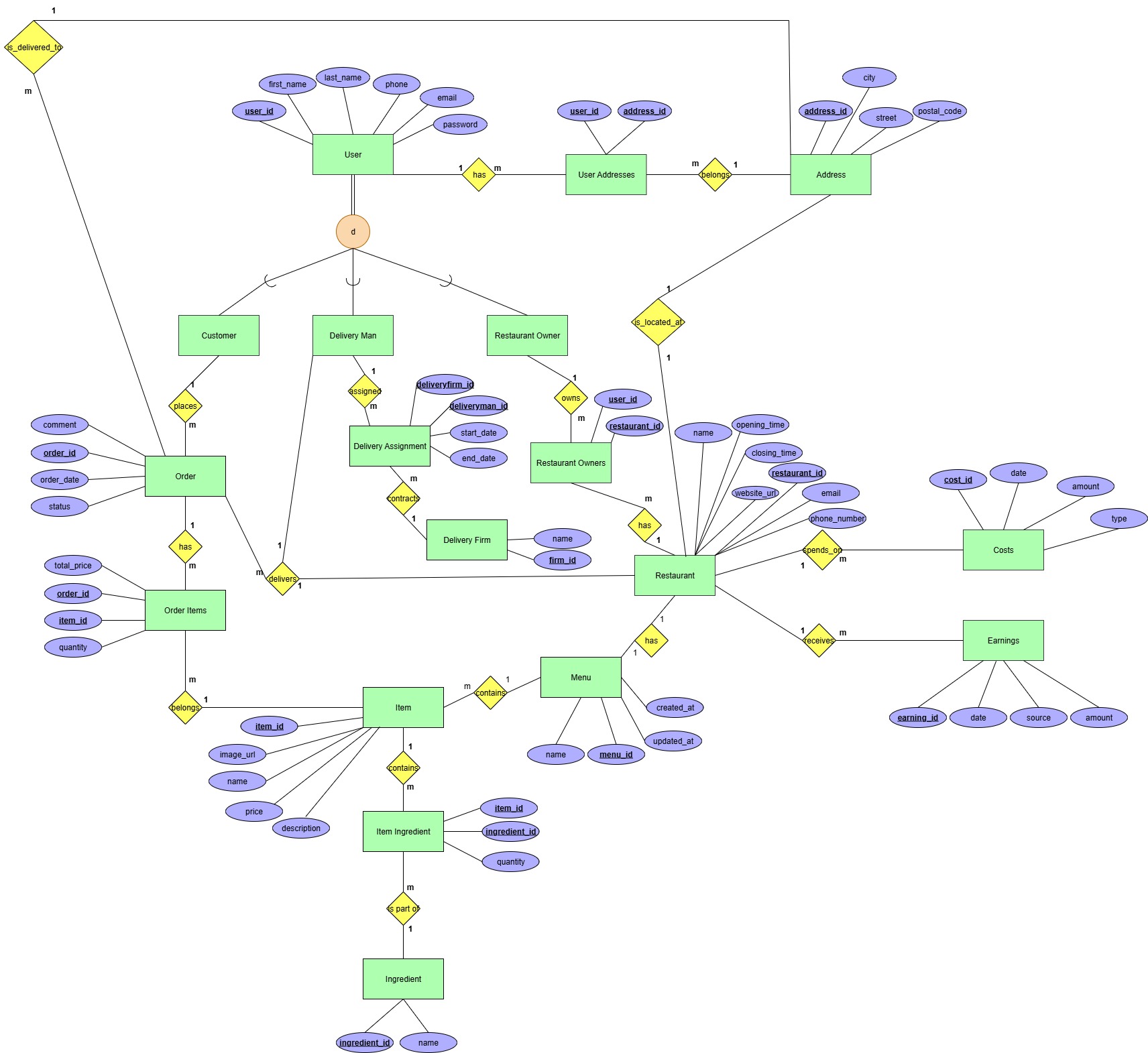 places – relation where an Order is prepared by one restaurant but can be delivered by multiple delivery men. A Delivery Man delivers multiple orders from potentially different restaurants. Restaurant produces multiple orders that get delivered by different delivery men.