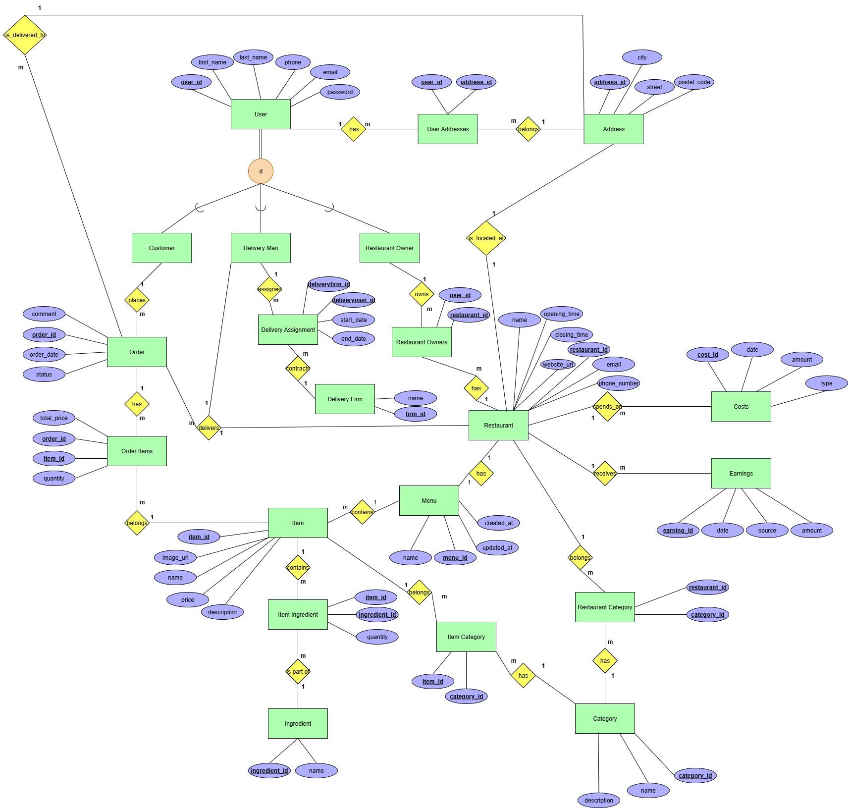 places – relation where an Order is prepared by one restaurant but can be delivered by multiple delivery men. A Delivery Man delivers multiple orders from potentially different restaurants. Restaurant produces multiple orders that get delivered by different delivery men.
