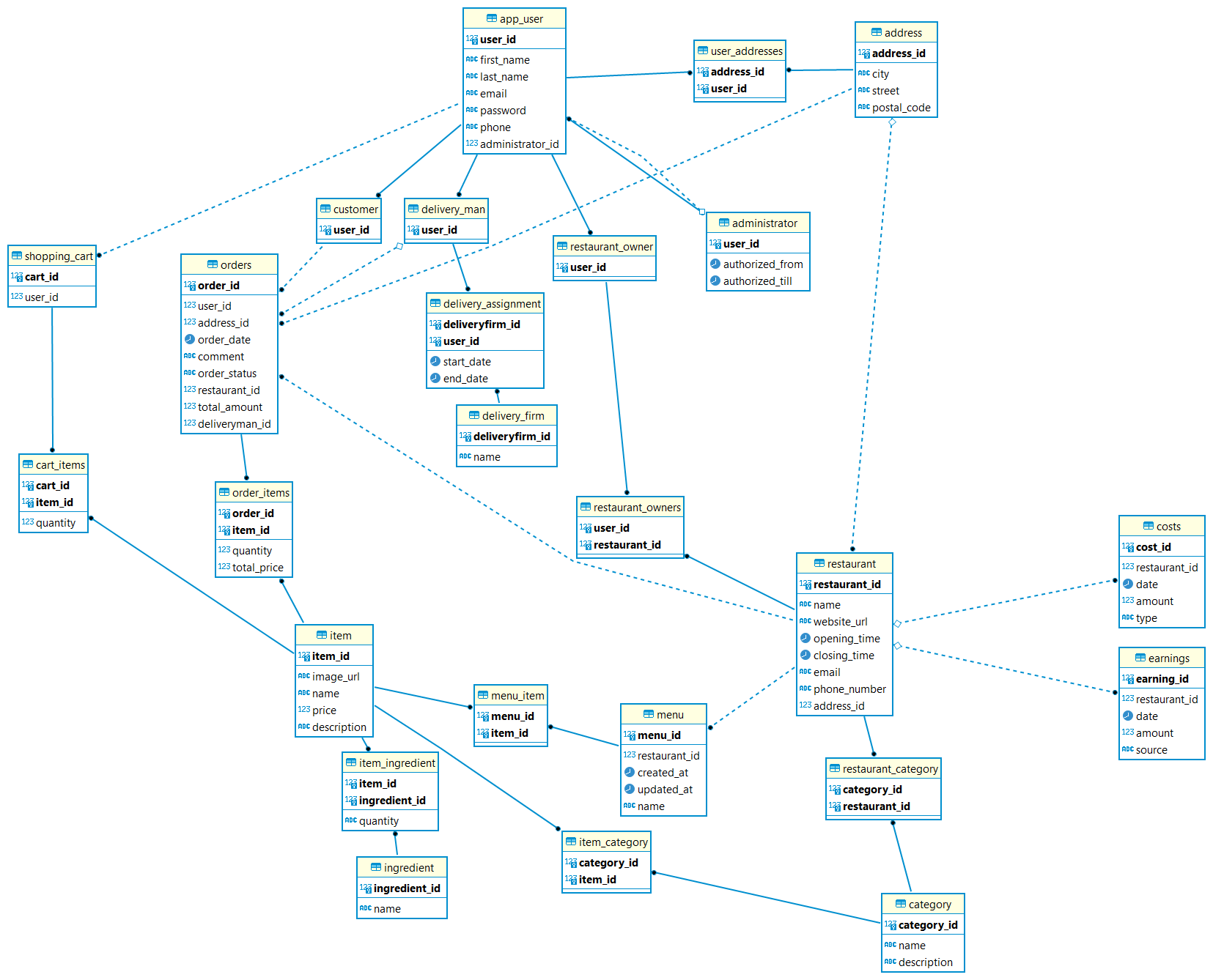 ORDERS(order_id, address_id*(ADDRESS), restaurant_id*(RESTAURANT), deliveryman_id*(DELIVERY_MAN), user_id*(CUSTOMER), address_id*(ADDRESS),order_date, comment, order_status, total_amount)