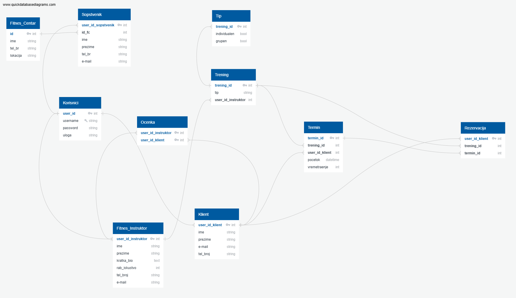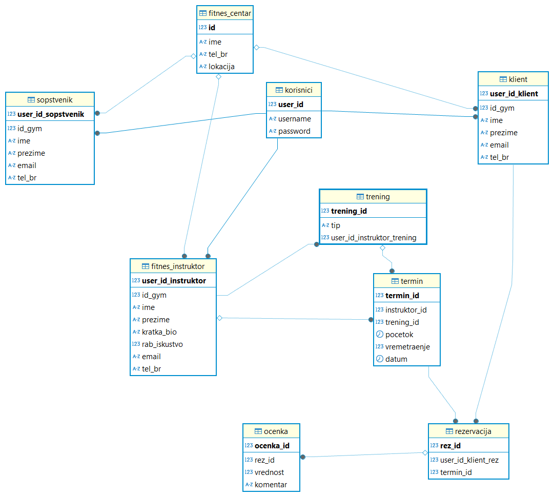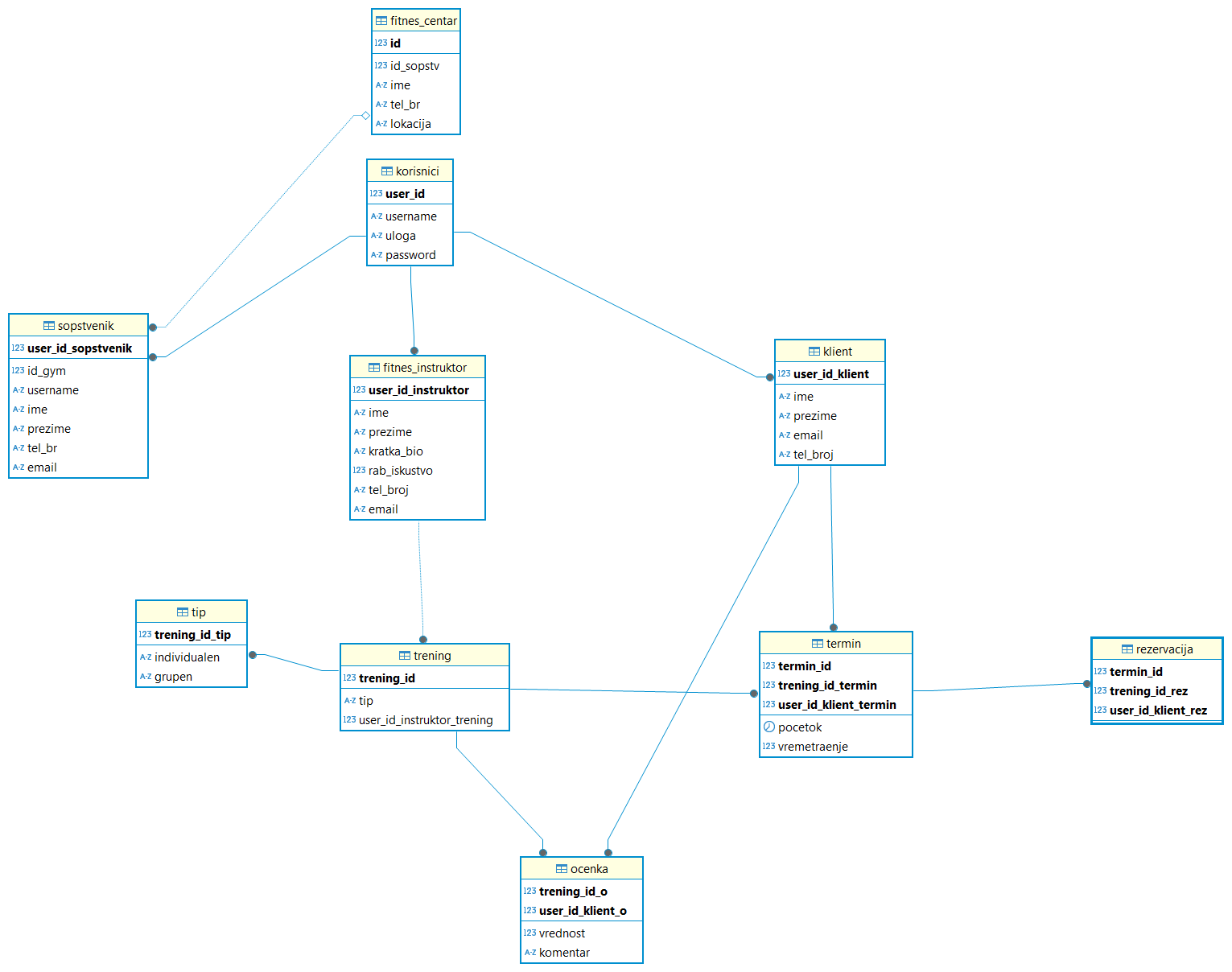 Klient(user_id_klient*(Korisnici), id_gym*(Fitnes_Centar), ime, prezime, email, tel_broj)