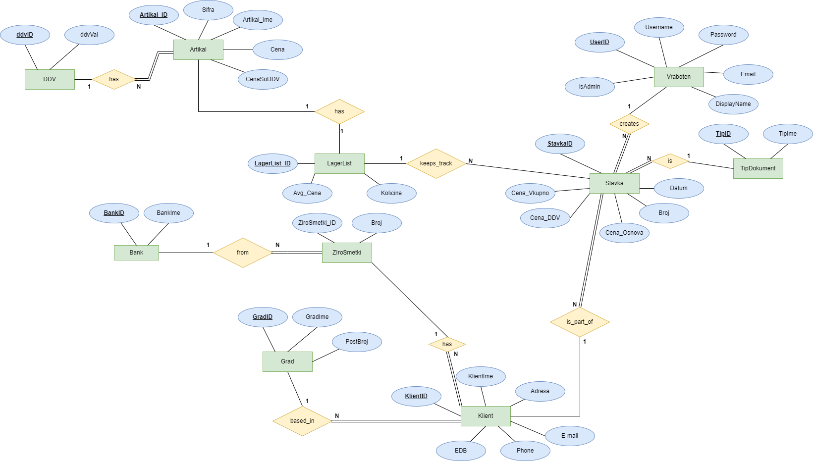 - has - Релација меѓу Artikal и DDV, повеќе артикли може да припаѓаат на една ДДВ тарифа, исто така секој артикл има само една ДДВ тарифа (тотална партиципација).