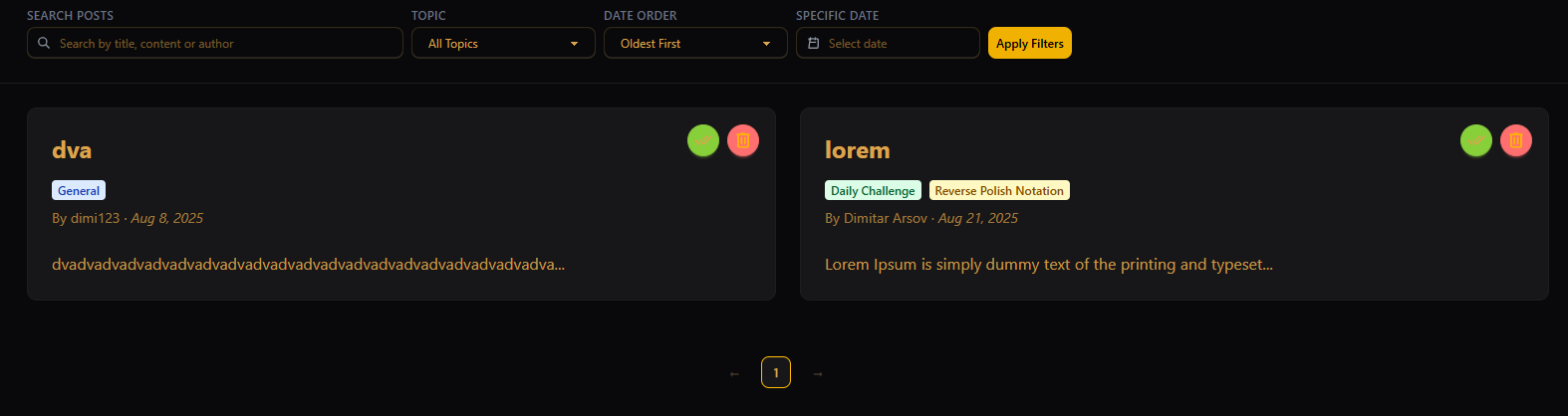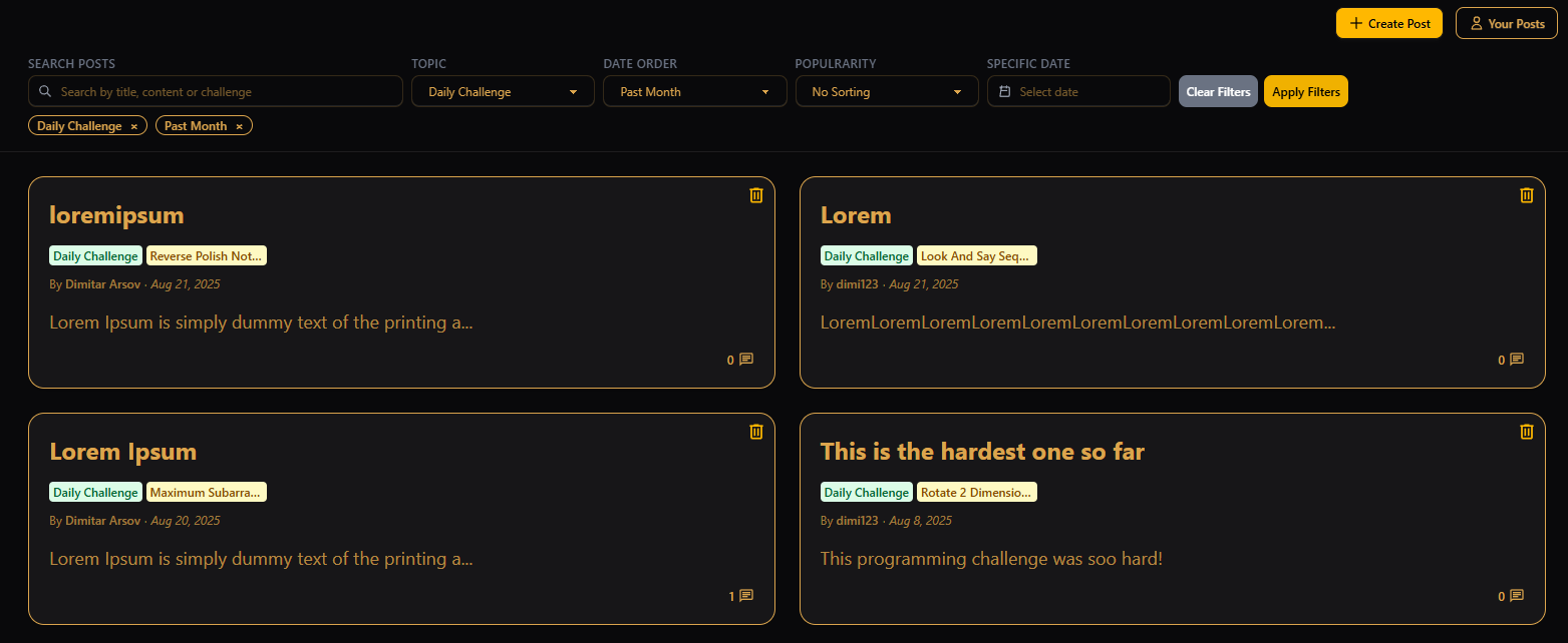 Корисникот има можност да пребарува објави на форумот според наслов, содржина и за кој дневен предизвик се однесува објавата. Исто така има можност и да го филтрира форумот според тема, односно дали објавата е за општа програмерска тема или за дневен предизвик, потоа според објави објавени изминатата недела, месец или година, според број на коментари и според специфичен датум на објава. Изборот на тема го прави корисникот кога ја креира објавата со тоа што има можност да бира помеѓу општа програмерска тема или конкретен дневен предизвик.