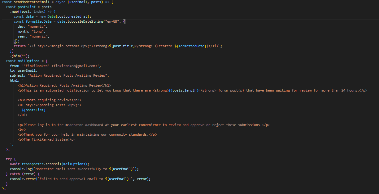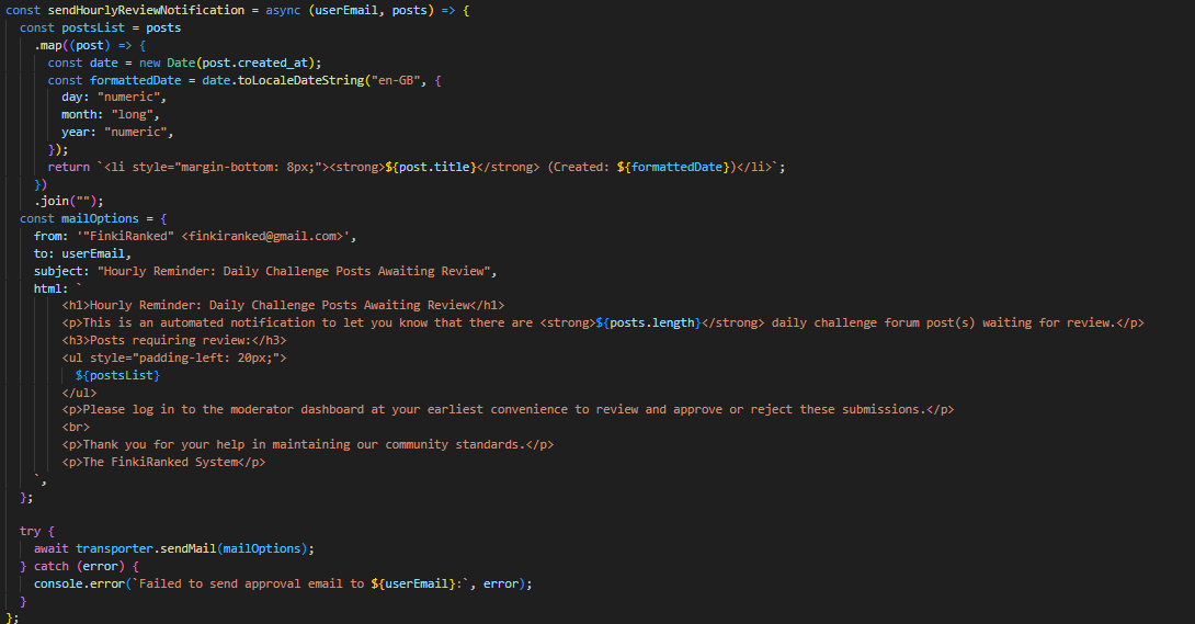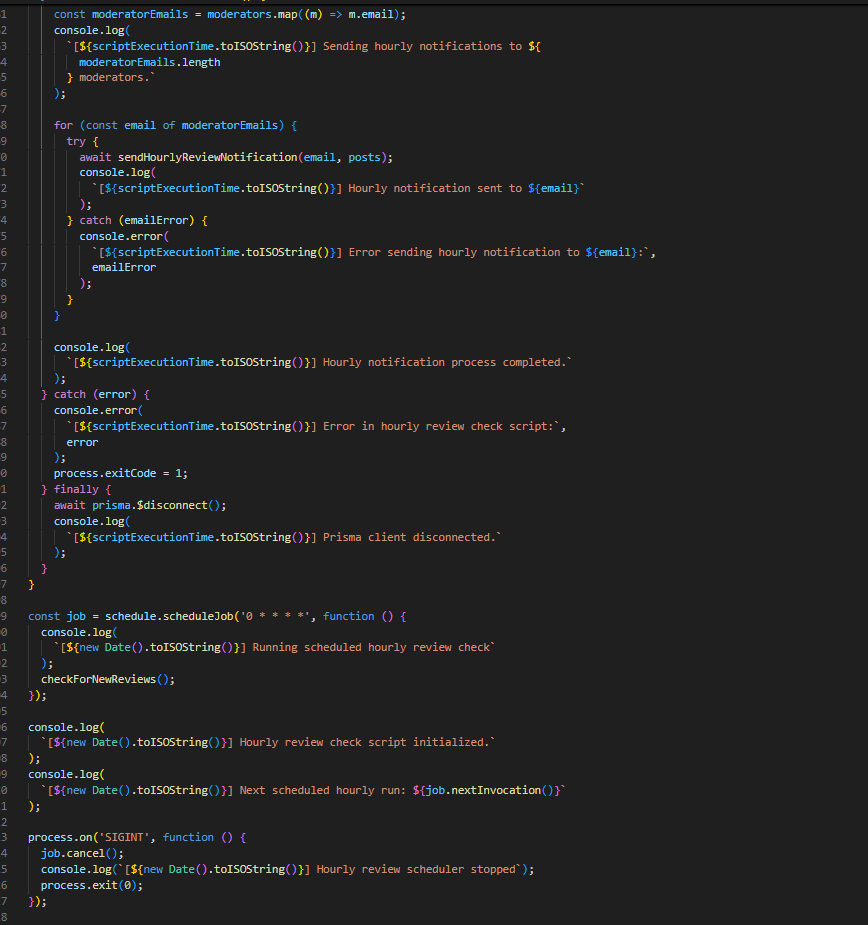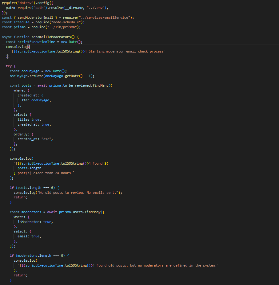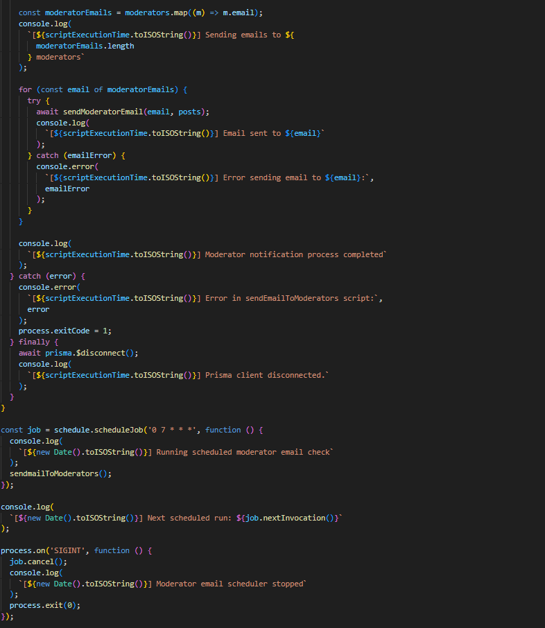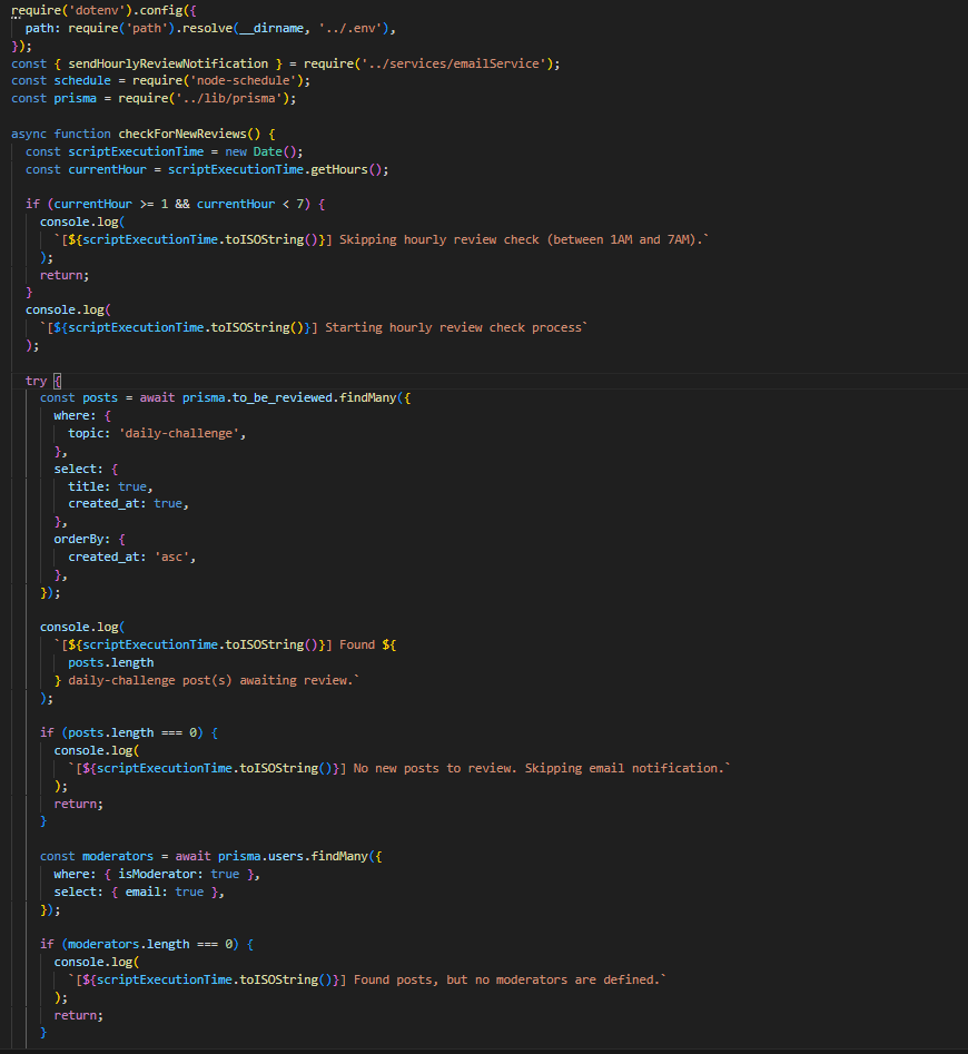 Со помош на PM2 и node-schedule, процесот за проверка и испраќање email доколку има објави на тема дневен предизвик, кои чекаат одобрување, се извршува на секој час. Доколку постојат вакви објави преку функцијата sendHourlyReviewNotification во emailService, се испраќа известување до сите модератори. Слично на тоа, секој ден во 7 часот наутро се проверува дали има објави (од двете теми) кои чекаат одобрување повеќе од 24 часа. Доколку постојат вакви објави преку функцијата sendModeratorEmail во emailService, се испраќа известување до сите модератори.