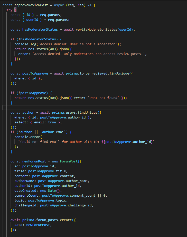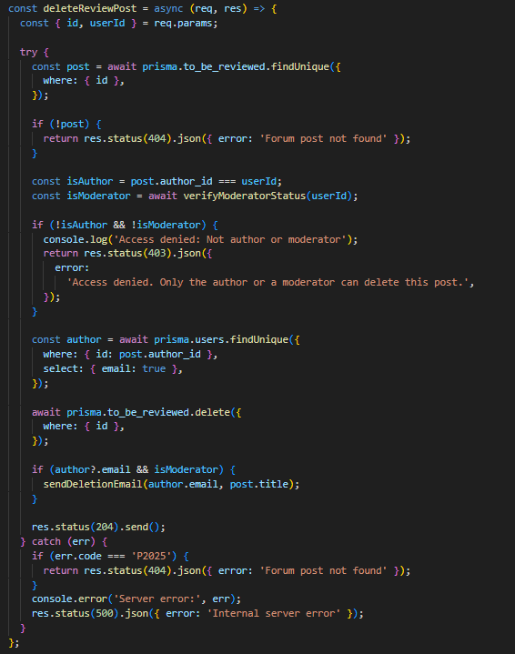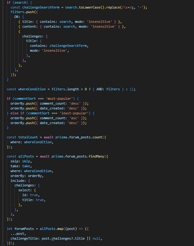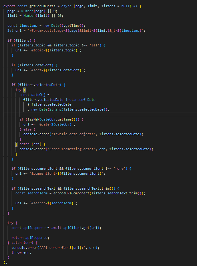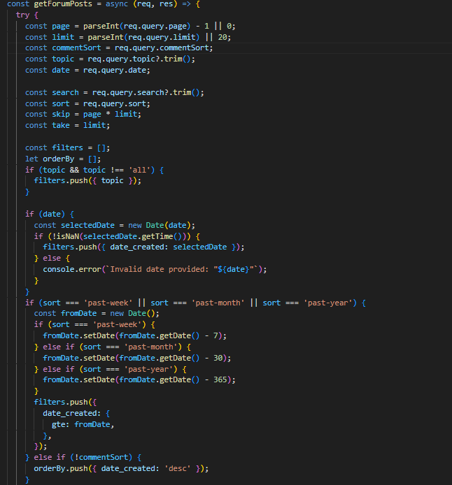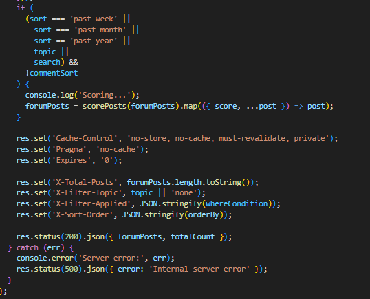 Потоа барањето се обработува од функцијата getForumPosts во контролерот, каде според соодветните query параметри се испраќа барање до базата. Доколку корисникот внесол соодветни филтри, објавите најпрво се рангираат според функција која ги приоритизира поновите објави, но во предвид се зема и бројот на коментари, па доколку некоја објава била „попопуларна“ ќе биде повисоко рангирана. Со тоа се воведува мала динамика на форумот.