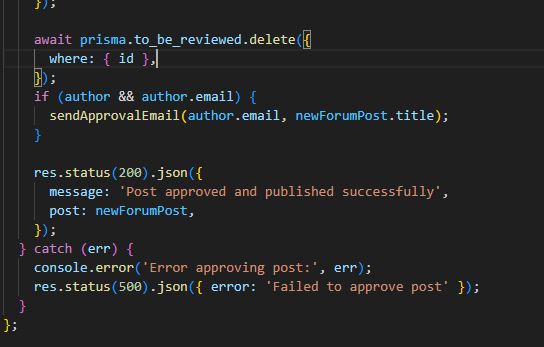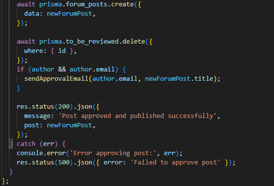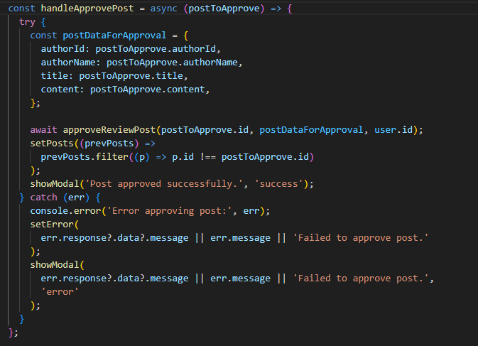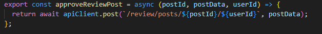 Функцијата handleApprovePost на клиентска страна