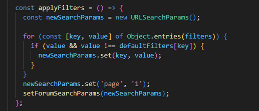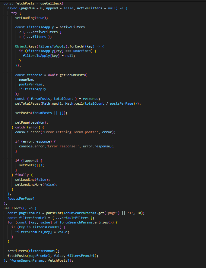 При промена на некој од филтрите се ажурира соодветното поле во објектот filters. Потоа корисникот притиска Apply Filters и се извршува функцијата applyFilters каде се ажурираат forumSearchParams, а тоа предизвикува повикување на fetchPosts функцијата преку која се испраќа get барање до backend.