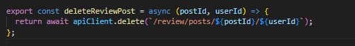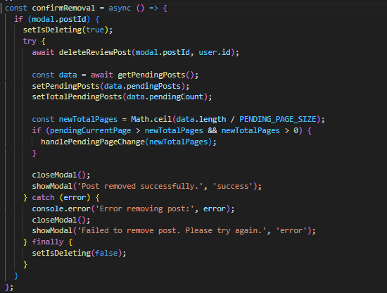 Исто така корисникот има можност и да го избрише барањето за одобрување на објавата со тоа што притиска на Remove Post. Потоа доколку се согласи, се повикува функцијата confirmRemoval преку која се испраќа get барање до backend. Барањето најпрво се обработува од reviewService, од каде се проследува до backend и е обработено од функцијата deleteReviewPost во контролерот.