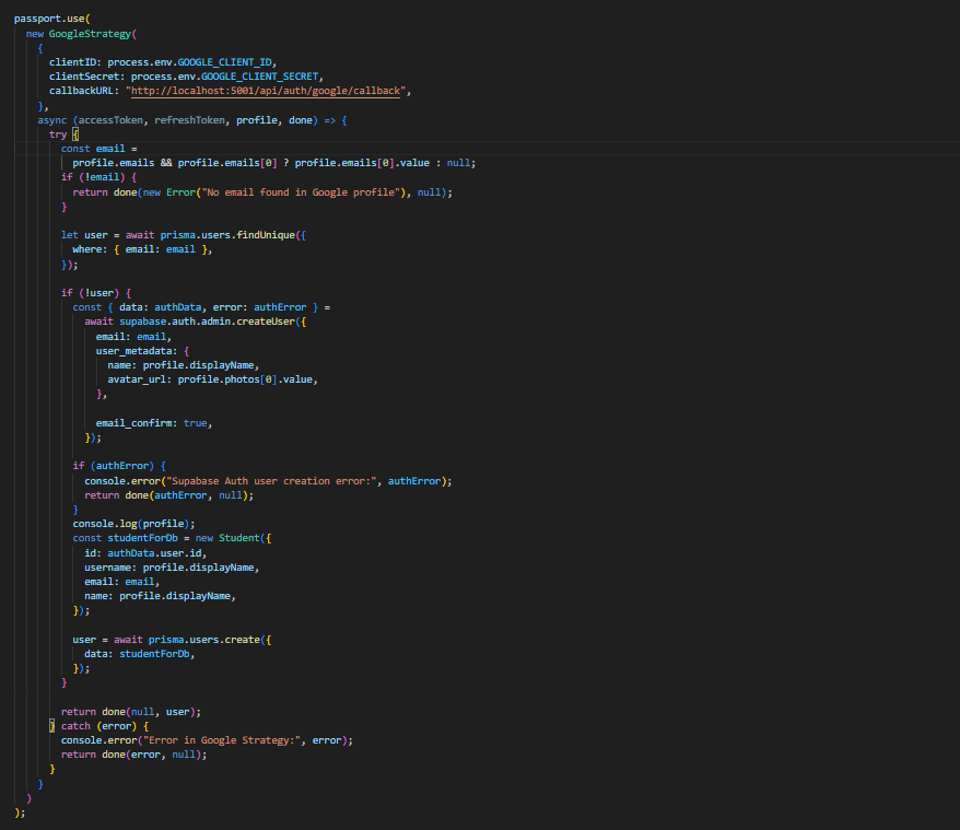 Потоа се извршува callback функцијата дефинирана со passport Google strategy, каде најпрво се проверува дали постои профил со конкретната email адреса, а доколку не постои се креира нов профил.