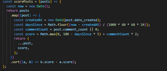 Функцијата scorePosts во контролерот