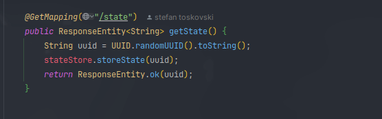 Прво, се пушта повик до Spring апликацијата за state параметар - уникатен стринг со цел заштита од CSRF напади.