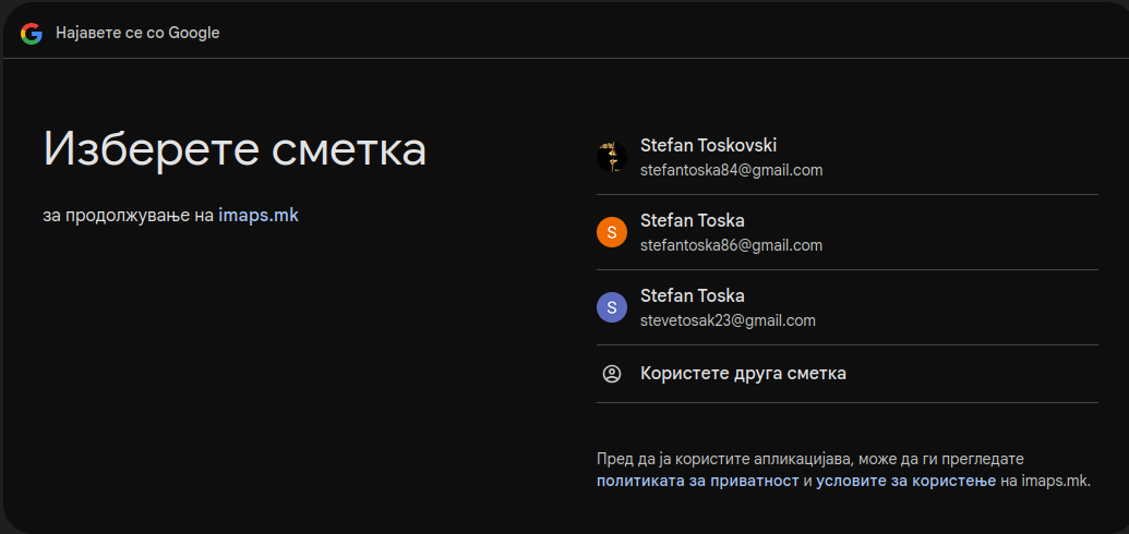 OAuth снабдувачот го прикажува својот поглед за најава и корисникот избира сметка со која сака да се најави на апликацијата.