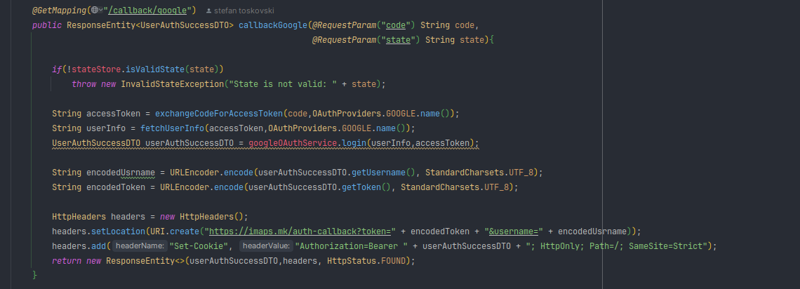 Откако ќе се кликне копчето за најава со соодветна сметка, OAuth снабдувачот праќа барање до Spring апликацијата со параметар "code" и параметар "state".