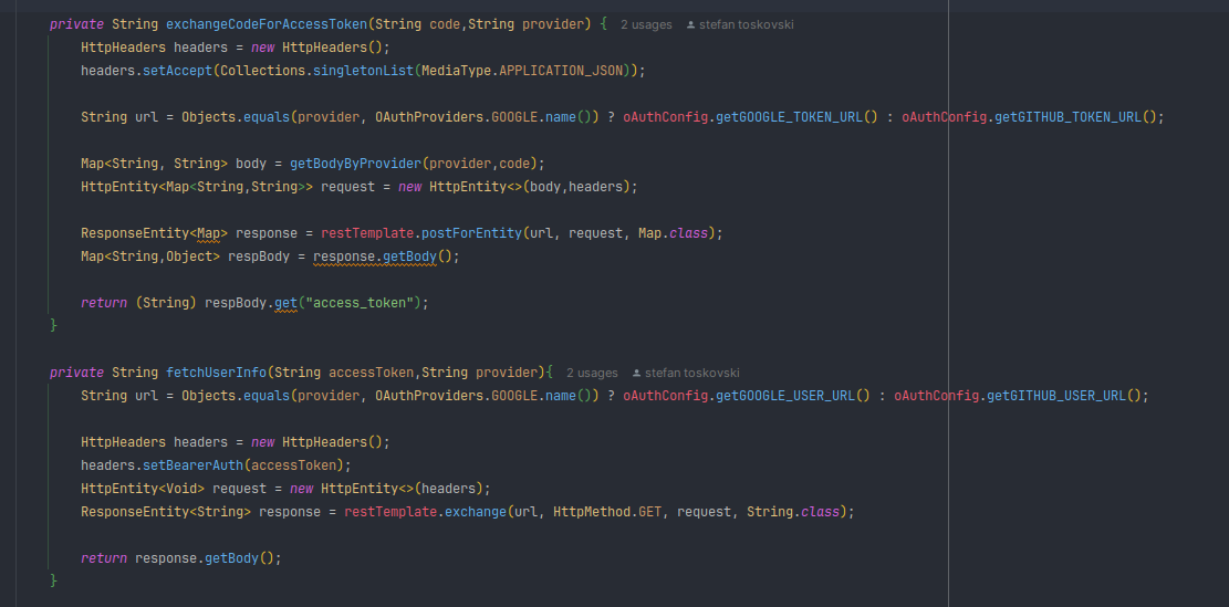 Од тука Spring апликацијата, корситејќи го "code" параметарот, истиот го препраќа на даден "endpoint" на OAuth снабдувачот со цел да се направи размена на кодот со што се добива "Access Token". Овој "Access Token" се поставува во заглавјето на следниот повик што се праќа до OAuth снабдувачот кој како резултат ги враќа потребните лични податоци на корисникот.