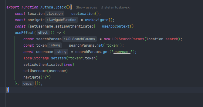 Конечно, се праќа повик до "endpoint" на React апликацијата, кој има задача да ги зачува JWT и пратените информации за корисникот, со што корисникот е најавен на апликацијата.