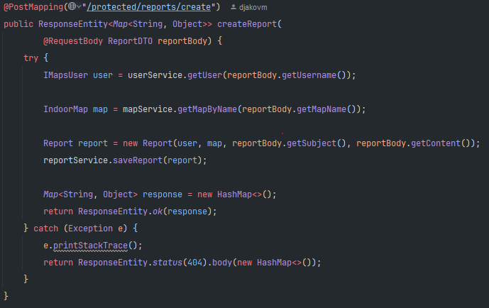 Во backend, извештајот се обработува преку методот за креирање на извештаи: