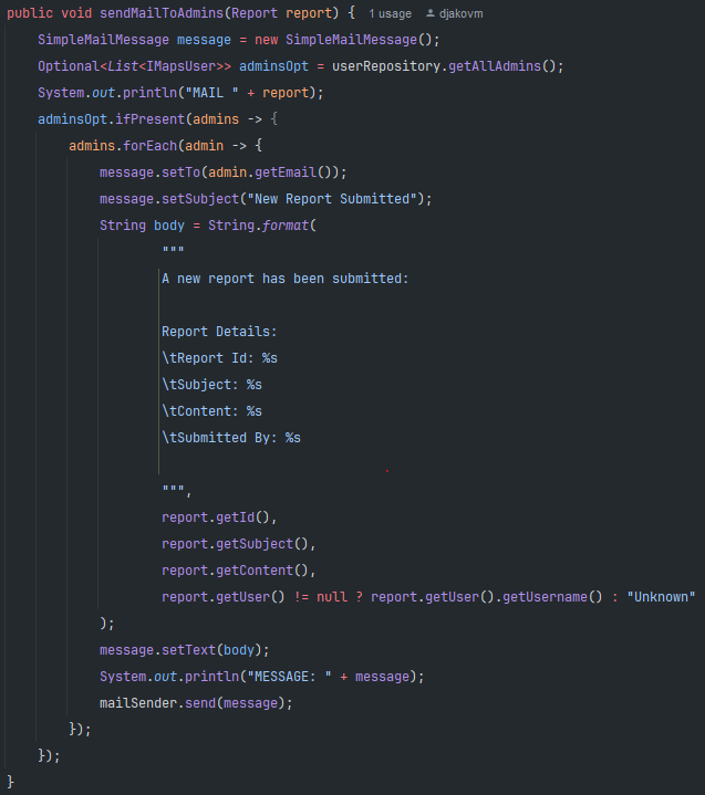 Извештаите се зачувуваат во базата на податоци преку ReportService. За секој зачуван извештај, се испраќа емаил до администраторите.